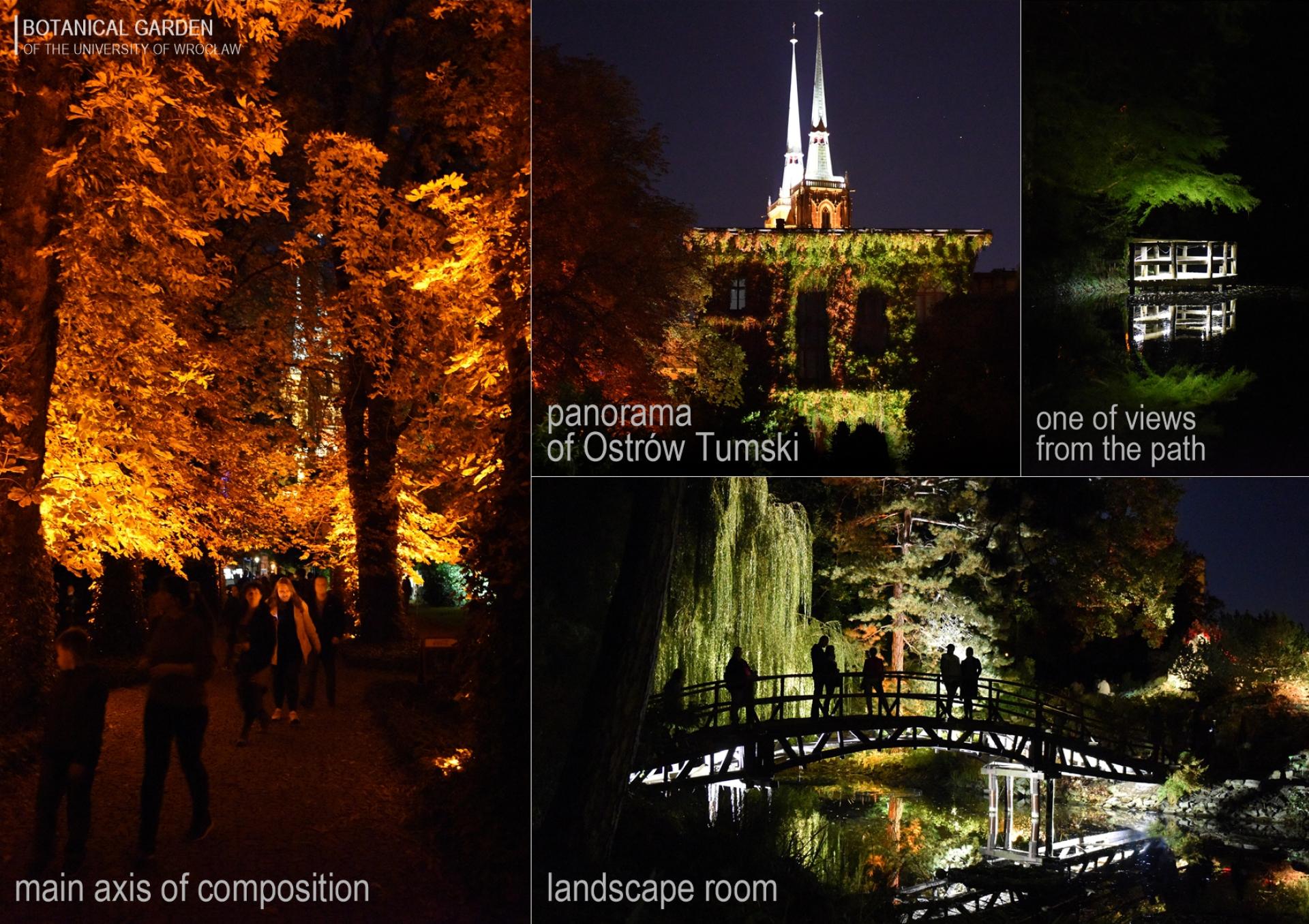 During the last illumination in 2021, the landscape effects and the impact of illumination on the viewer were assessed with the help of students of all Wrocław universities. A map of sensations evaluated using a scale of feelings’ intensity was created and a questionnaire for visitors to the Botanical Garden was prepared. All respondents indicated the level of pleasure and a sense of security they had felt while walking.
