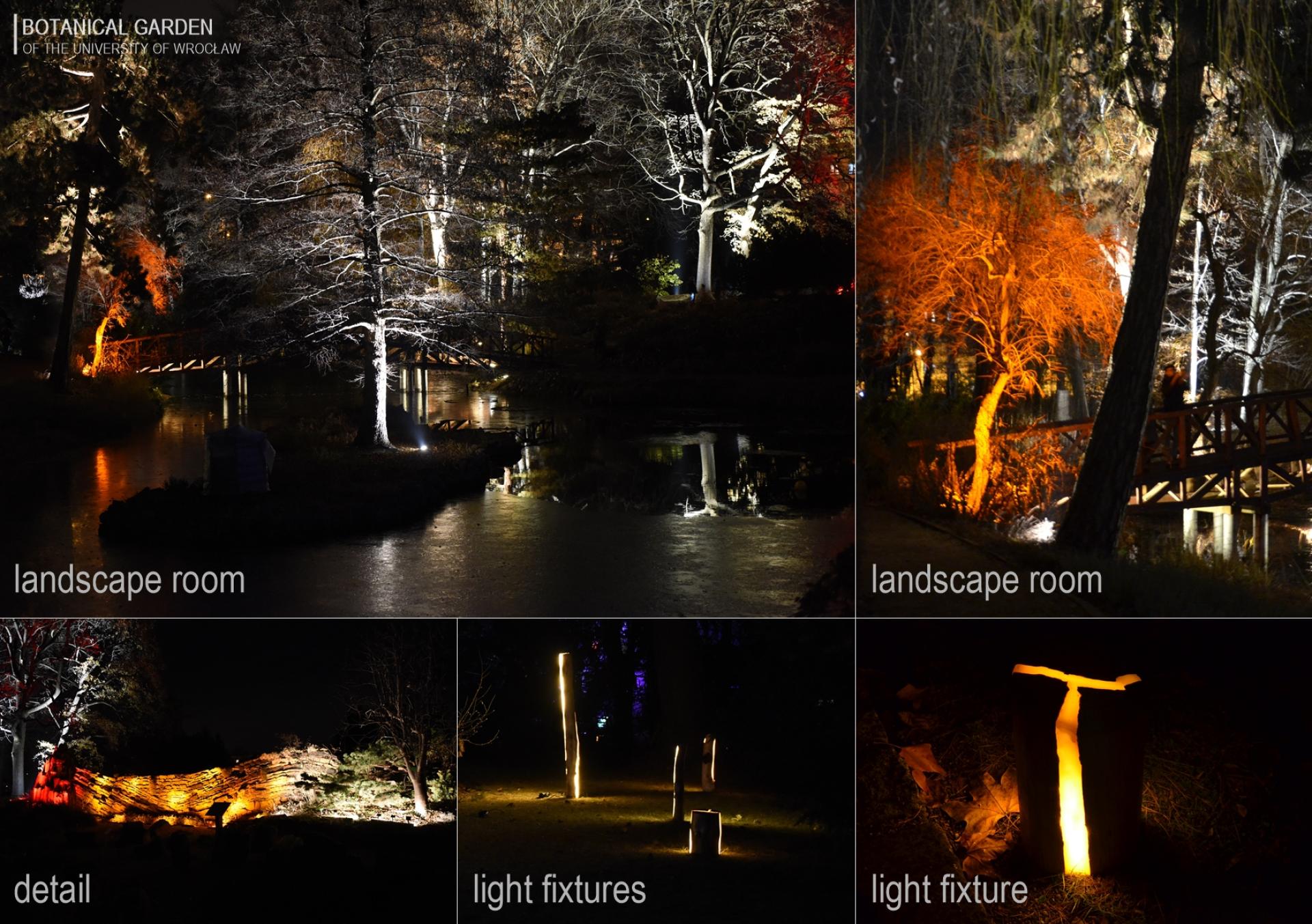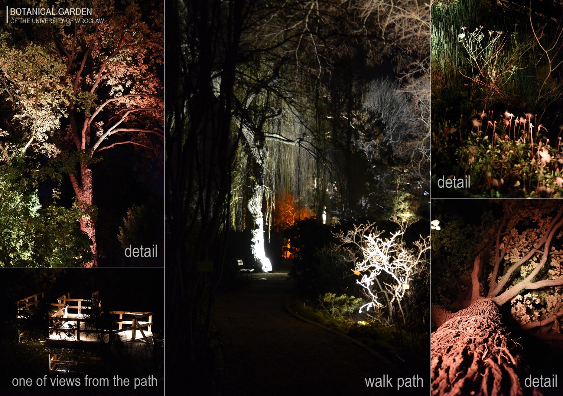 The first illumination project for the Botanical Garden was implemented and installed with the participation of students of landscape architecture at the University of Life Sciences in Wrocław. Students had a chance to experience that the design process is not always continuous. Sometimes it was necessary to take a step back, make adjustments and go through the same stage again. They realized that working with light is particularly difficult in the landscape aspect. This is due to the dual nature of light which, on the one hand, is a medium- necessary for us to objectively and subjectively perceive the existence of things. On the other hand, it is a value in itself - being a physical radiation abiding by the laws of geometric and wave optics and as radiation influences strongly all living organisms. It has the variety of its own form, structure, color and meaning.