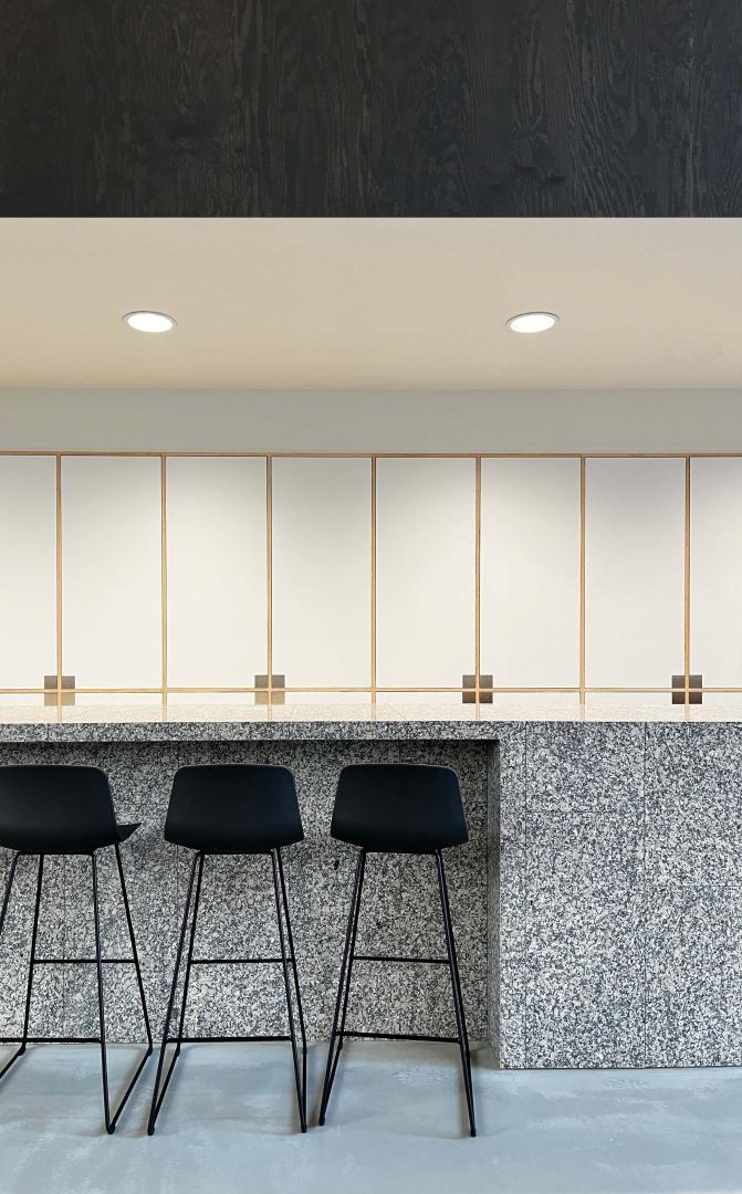 The aspect of sustainability and circularity can be found on many levels in a project. The first exemplary step can be found in the very beginning of the project. Rather than moving out of the city and building something new, we chose the less convenient option to renovate an existing building in a dense urban context. By doing this, we allowed the building itself to be circular and prevented a lot of new building materials from being made in the first place. One of the most important strategies that is implied is 'shearing layers': the supporting structure, façade, techniques, furniture, etc. are designed separately from each other, so that adjustments of elements with different lifetimes can easily be done in the future. The supporting structure is the element that will be there the longest times, meaning it needs to be the most flexible one. That is why a porch structure with a large span is used instead of fixed walls. The next layer, the façade and roof, are constructed in a way it is detachable again. This means screw are used instead of glue, mineral wool is used instead of PUR-foam and so on. This makes it easier to repair something or renovate it in the future, but also guaranties that the used building materials can be separated and re-used as much as possible in the future. In a next layer we looked at the interior elements. A study was done by Rotor, an organization specialized in circular architecture, to see which elements could be recuperated from the existing building. As a result, when you walk around the campus now, you can for example see recuperated tiles in the toilettes or a bar in recuperated granite (see photo 1). We believe the approach to circularity is never one story, but a lot of different stories meticulously combined. This multi-layered approach throughout the whole design and building process guarantees that the building is sustainable on the long term.