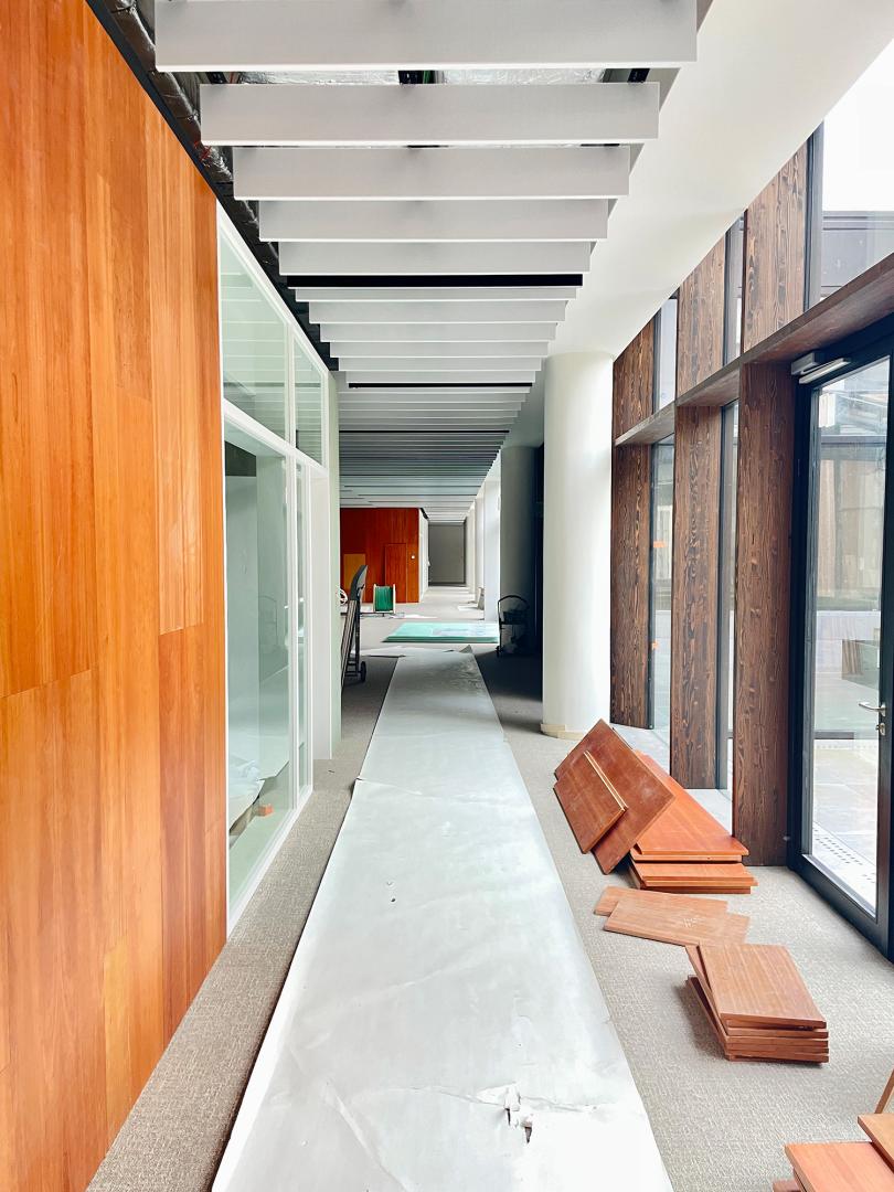 The new extension of the building is very light and dynamic. Soft wood materials and a green roof not only make it a very elegant and subtle extension, is also delivers an enormous quality of experience from the inside by creating views on outdoor green spaces and getting a lot of direct sunlight (see photo 4, 5 and 6).The project is a combination of renovating the existing building and adding a new extension. In the existing building, several areas were “no-touch zones”. Here the interior of the 80s building stayed completely visible. Other zones are renovated, and you see a combination of old and new materials. Other zones are new, but materials from the old building were re-integrated. It was crucial in terms of aesthetics to find a good balance between all these (new and old) materials. This was only possible because of the willingness of the contractor and the client to test certain combinations on site. A perfect example of this was the use of old wooden doors that were recuperated from the building and used as panelling (see photo 2). The distinctive red-brown colour of the doors is very present, that’s why we decided to keep all the other materials in this area more neutral. The doors themselves had already survived more then 40 years and during this time they, of course, got damaged. Because they came from different rooms with different sunlight, they each got slightly different colours. To assemble these doors as panelling on the walls of new classrooms, we went on site to discuss the design and see what was possible. This open dialogue during the construction was essential in the process. We discussed which doors could be used and which were too much damaged, we discussed how the joints should be made and how doors with a different colour should be spread out. The result is something that all the participants are very proud of, showing that recuperating element can also be used to make very beautiful and meaningful architecture.