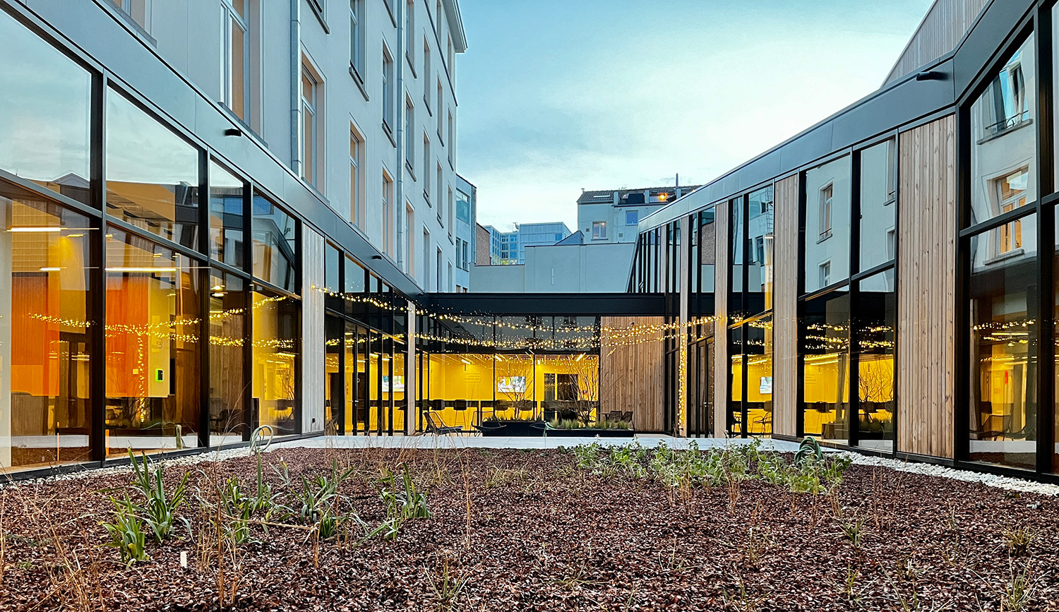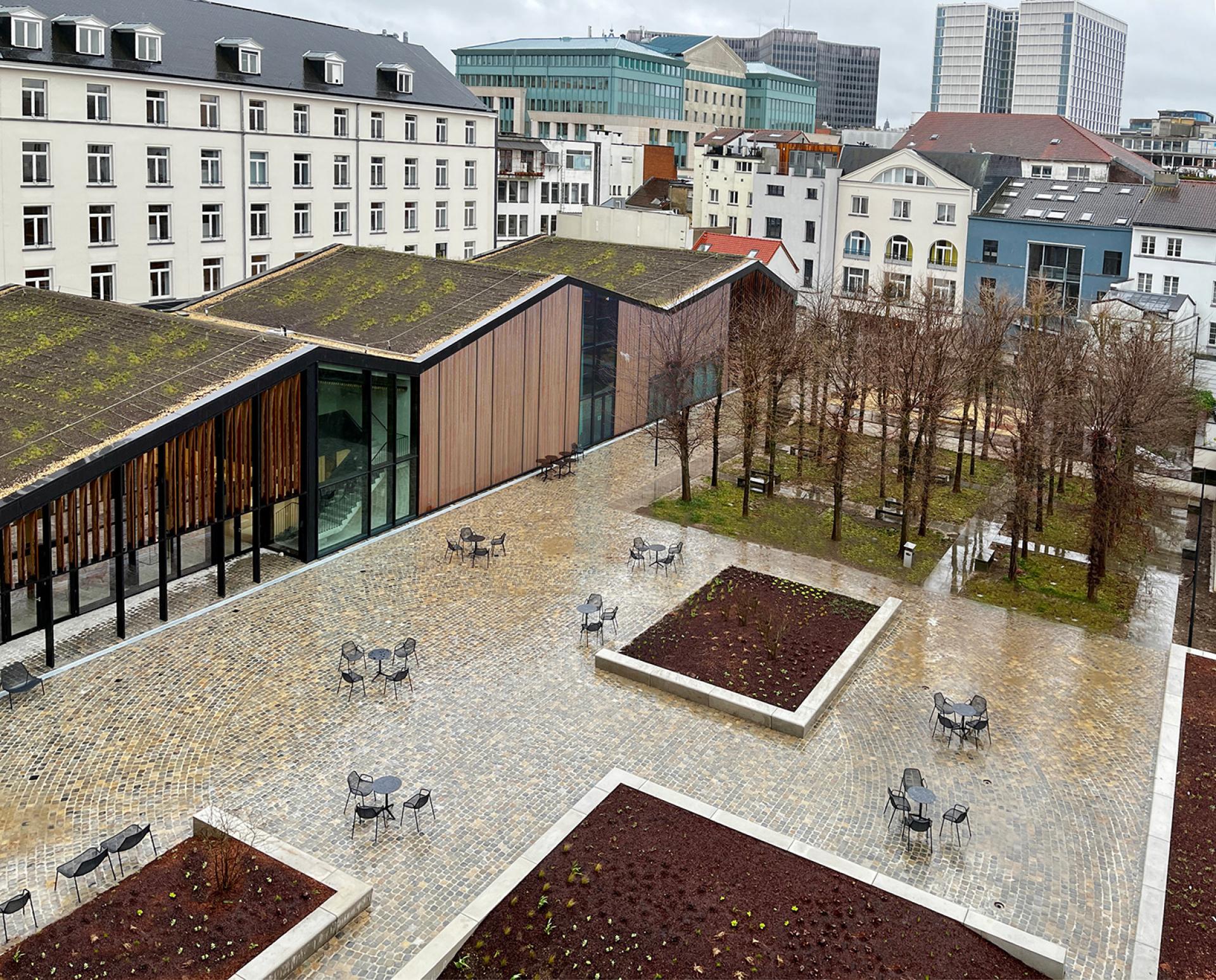 The renovation of AG Campus is an ambitious and sustainable project in the centre of Brussels. It introduces light, air and space. Throughout the renovation, materials were chosen as sustainably as possible and maximum effort was made to preserve and reuse materials from the existing building. The roof of the new extension was implemented entirely as a green roof and additional green spaces were added in the garden, adding in total more than 1500m2 of green spaces in the heart of Brussels.