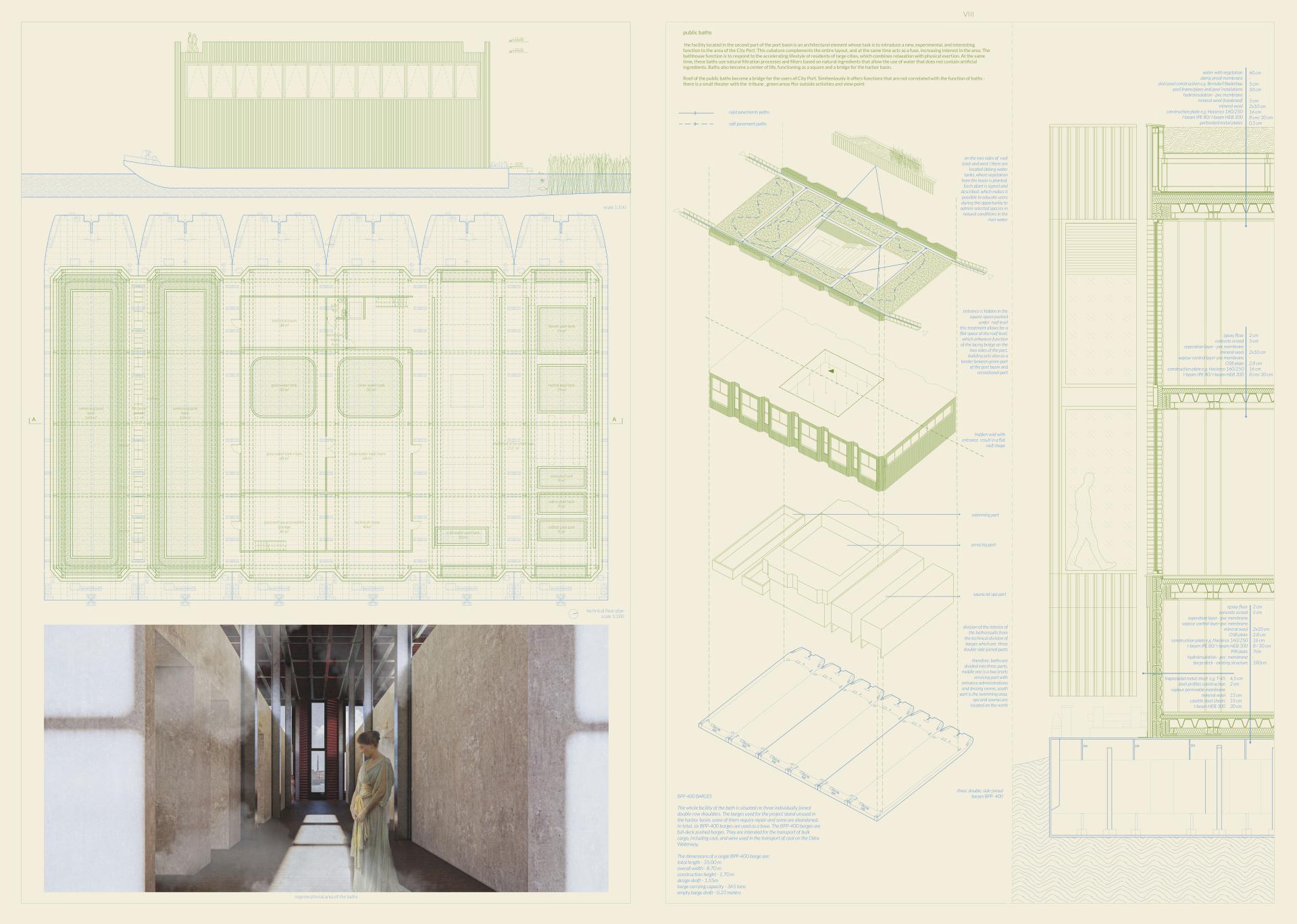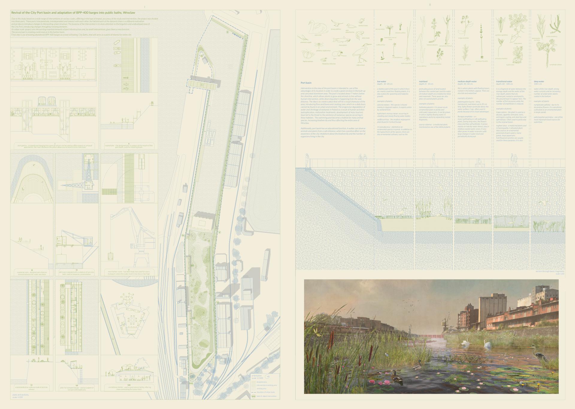 The subject of intervention is the abandoned hundred-year-old City Port in Wroclaw. More precisely, a part of it - the port basin - which is an element initiating the renewal process of the entire area. The port basin is connected with the Odra River and located in the central part of the City Port. The proposed idea combines three features: bringing back to life valuable fragments of urban tissue, the application of areas promoting urban biodiversity and the introduction of an object with an unusual function that uses the possibilities and highlights the character of the place. The project on an urban scale uses the existing essential elements of the port infrastructure and gives them a new function through minor intervention. The second intervention is to create a wild, green enclave in the port basin. Intervention in the area of the port basin is intended to use of the advantages of its location in order to create a green enclave in the built-up and concreted downtown area. The pool is located about 7 meters below the shoreline, which allows plants to grow and animals to live without human intervention, while observing what is happening from the save distance. The last step is to use the existing abandoned BPP-400 barges as a base for floating city baths, which will be a point of interest for the entire location .The is an architectural element whose task is to introduce an interesting function, increasing interest in the area. The bathhouse function is to respond to the accelerating lifestyle of residents of large cities, which combines relaxation with physical exertion. The roof of the public baths becomes a bridge for the users of the City Port, it also offers functions that are not correlated with the function of the baths - there is a small theater with a stand, green areas for outdoor activities and a viewpoint enriched with water tanks illustrating the diversity of plants growing in the port basin.