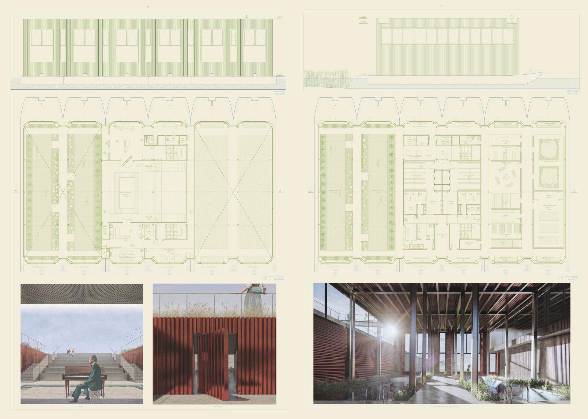 The main objective of the project is to reuse what is already existing. In an urban scale, development of the project is based on reuse of existing port infrastructure, through giving it a new function (e.g. change of railway tracks into pedestrian and bicycle routes, use of historic cranes as hostels). In terms of intervention in port basin, sustainability is made through using existing conditions in order to create wild green infrastructure that naturally filtrates basin water, reduces Co2 and is a habitat for animals. The public baths reuse BPP -400 barges that are stocked in the city port. The passing times of the river transport contributed to the lack of utility of those barges. Building is designed as a self-sufficient, green roof with solar panels, natural filtration of the water in the pools and natural ventilation of the area of baths and saunas. To make baths as natural an sustainable as possible water is naturally filtrated by systems of filtration, which do not require the use of chemicals.