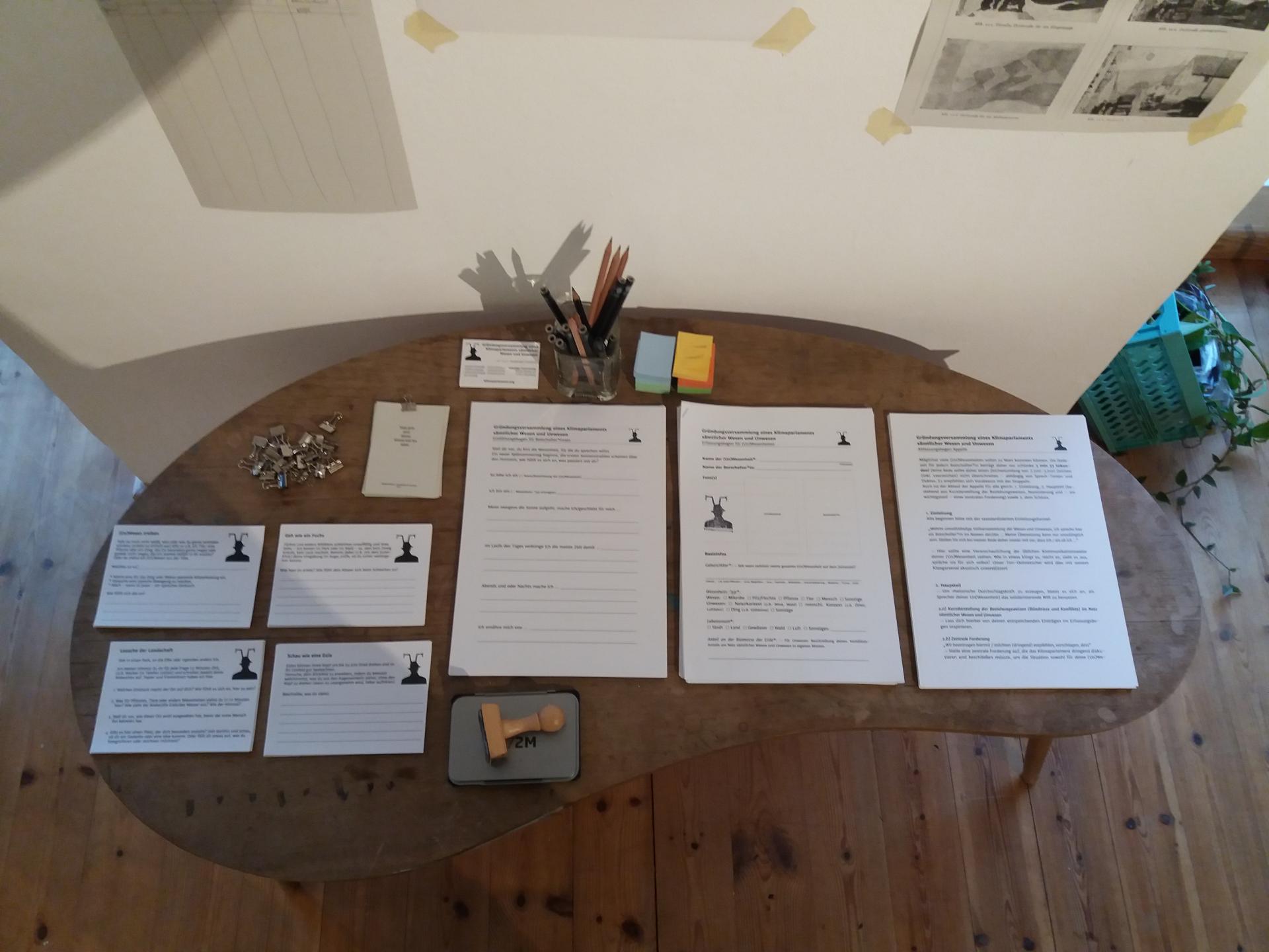 We strive for a comprehensive aesthetic and content design of the theater evenings and the whole process leading to it. A musician has created music for the project and acoustic translations of non-human voices, we have developed our own "bureaucracy" with a stamp, forms for the empathic work and guidelines. This serves to give orientation to the participants in the unfamiliar situation.