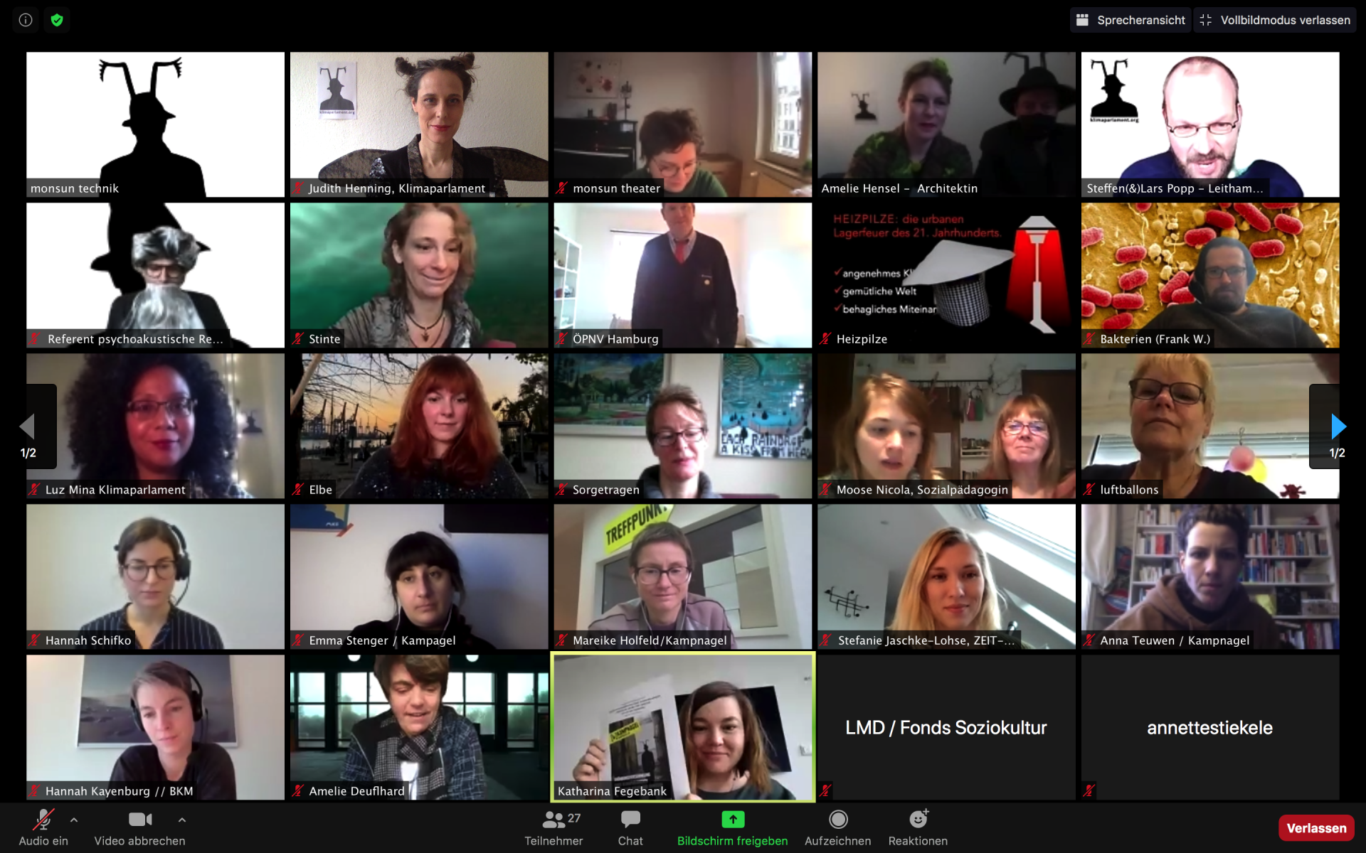 The participatory theater project Climate Parliament gathered ambassadors in summer 2020 who spoke for creatures and inanimate things. They discussed in three assemblies how to improve their conditions of existence in the face of climate change and passed resolutions that were presented to Hamburgs 2nd Mayor Katharina Fegebank in December 2020. By empathizing with other creatures such as swifts, earthworms or inanimate things like a car, compromises were negotiated over a wide variety of needs.