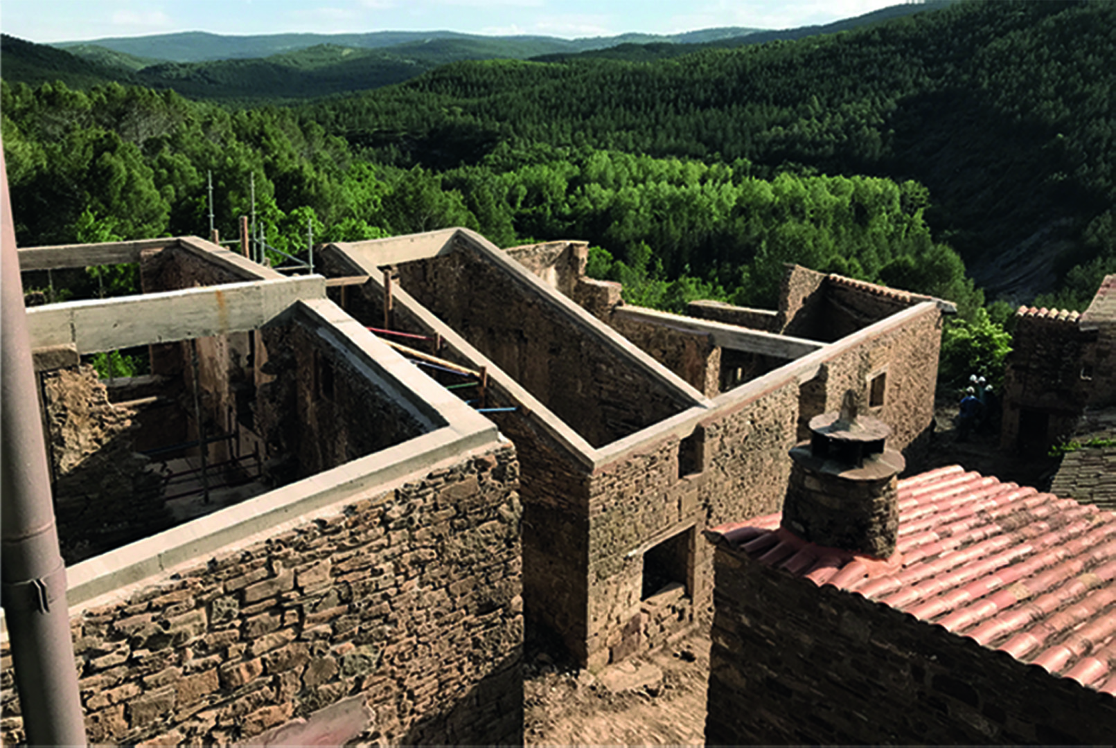 The exceptionality of acting in Ruesta and its surroundings consists in acting in a unique atmosphere, where the intervention has always sought naturalness and minimum impact, but also recognisability, to allow a clear reading between the original elements, and the contemporary elements. All this allows preserving and enhancing the value of the pre-existence. The intervention eludes the historical fake and presents Ruesta naturally, as it is, like a beautiful ruin, which maintains the elements that define the essence and urban environment that it once had. The first action consisted in consolidating some of the houses in Centre Street, the structural consolidation is designed from the joint work of all building structures, as an organism. The concrete beams make up an upper ring that prevents lateral movements, protects the upper part of the stone walls and, as a souvenir, draws a white line that defines, from the air, the design of the old village of Ruesta. The criteria that would rule over all the interventions are as follows: there is not only a structural intention in the preservation of the ruin, but also an important visual intention. Far from presenting the ruin as a dangerous element, the scaffolding and reinforcement elements help to interpret the urban environment of the old Ruesta with a subtle language. Thus, avoiding the negative visual impact of the diagonal struts, we designed timbers that clear the holes and also serve to recover the image of the window’s old structure of the "Camino”. In Ruesta's San Juan chapel, the reintegration has been carried out with a critical restoration, where the lost volume, of approximately 60%, has been recovered with an abstract and unitary language.