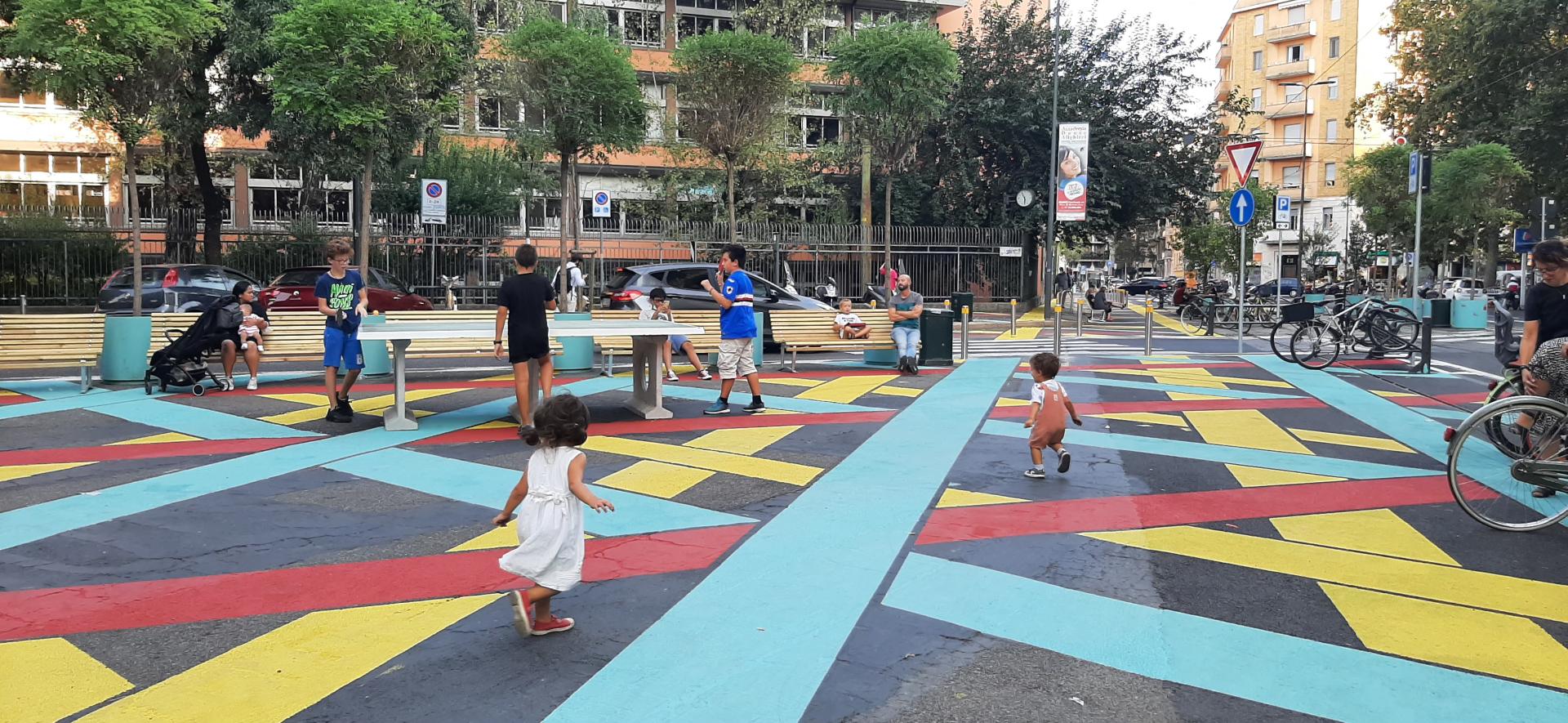 The results of this multi-layered experimentation are not only newly pedestrianized public spaces in strategic areas of the city, with the neighborhood life reactivated and fostering more sustainable lifestyles; they are also the production of pieces of original public art co-designed with the neighborhoods, mega illustrations at the urban scale of uncommon visual impact and aesthetic appeal, creating an essential precedent to the whole discipline of urban design in Italy. In 2020, the City of Milan issued a call for visual and relational artists and designers to mediate the participatory process in the pandemic year. By doing so, 43 proposals were collected from all Italy and abroad, beautiful site-specific graphic artworks. The winning proposal merged the artistic work of roman muralist and illustrator Camilla Falsini with the citizen engagement abilities by Jungle collective, resident in the neighborhood.The project includes different artworks but with the same aesthetic language. These include a small colorful area with a composition of shapes evoking an ideal two-dimensional city influenced by the tradition of the of classical Milanese design masters of the “Memphis” era and a graphic artwork containing a small maze with shapes for kids that can be interpreted as a playground for outdoor games. In addition, the inclusion of 32 ping-pong tables, asphalt art has led to a to a remarkable aesthetic effect in terms of street furniture, and has promoted children playgrounds creation and community gatherings within this new public space. In NoLo (North Loreto)district, the new Piazza Aperta consists of a multicolored pedestrian space in front of a primary school: the paving is colored in yellow, and blue, and flower boxes with racks, benches and ping pong tables have been added. The new space not only has more boundaries, but it also serves as improving the safety of pedestrians and cyclists, with a particular focus on children, elders and people with disabilities.
