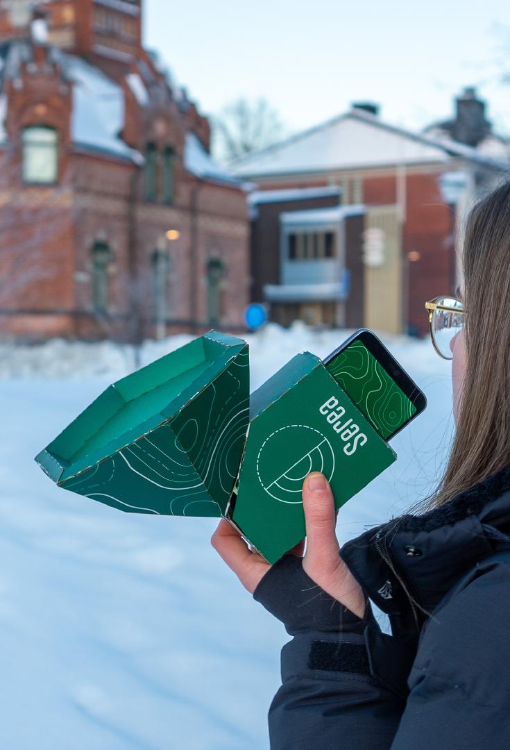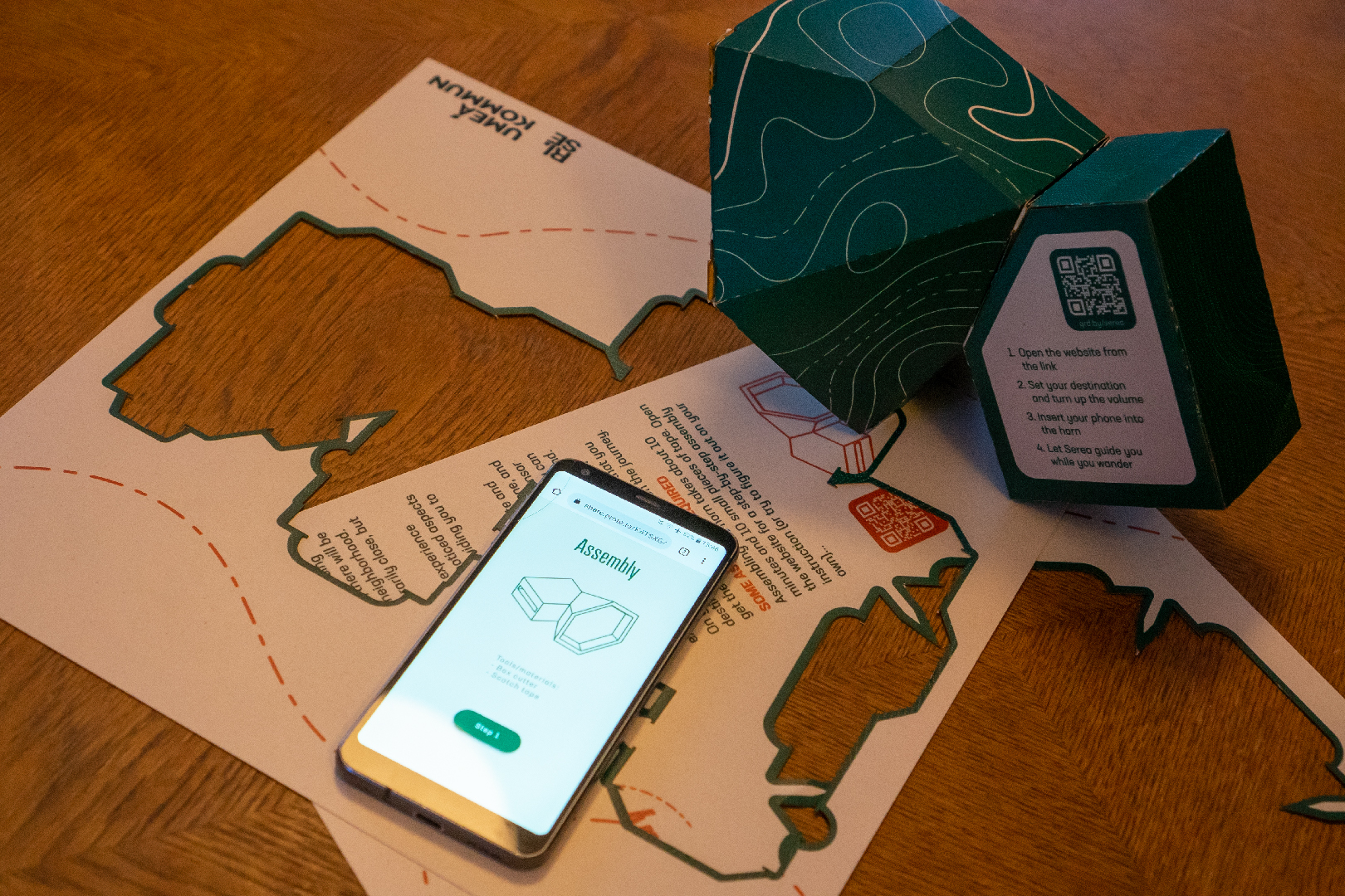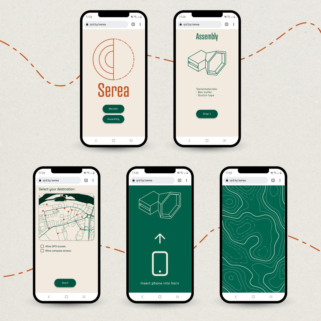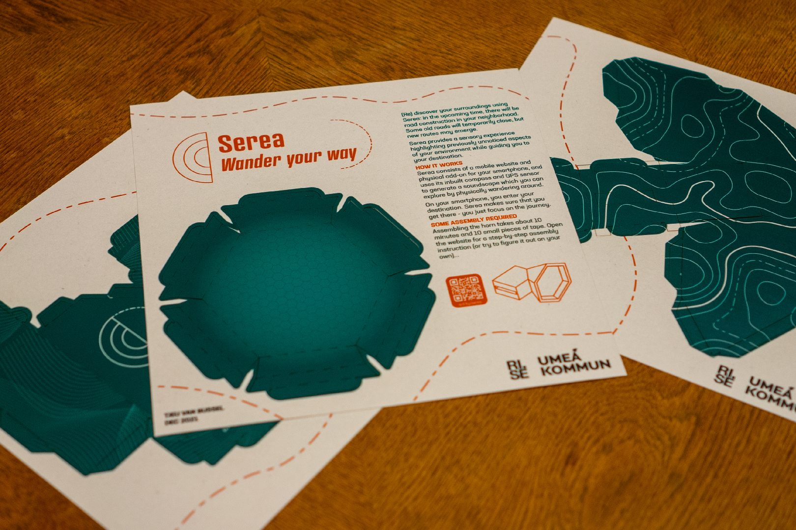 Serea is an intentionally ambiguous navigation device that uses a dynamic soundscape to guide the user to his destination while their senses are directed towards the present. Consisting of a DIY cardboard horn with accompanying web-app, Serea uses the GPS and compass sensors of modern smartphones to generate a soundscape that changes based on the user’s location and direction. By varying the intensity of the soundscape while the user moves the horn around, Serea nudges the user to follow the direction in which the soundscape increases in intensity. This kit can be distributed by the municipality of Umeå to local families, leading up to a major road construction, to reframe the construction period from a nuisance into an opportunity for new experiences of one’s surroundings.