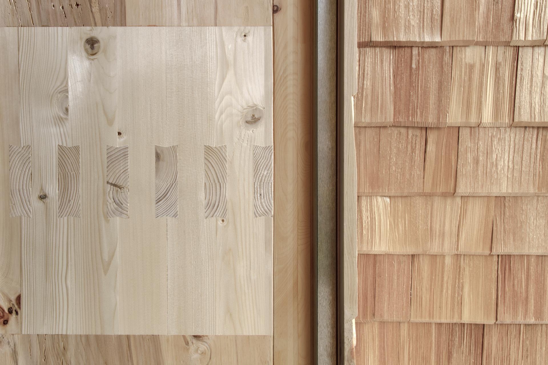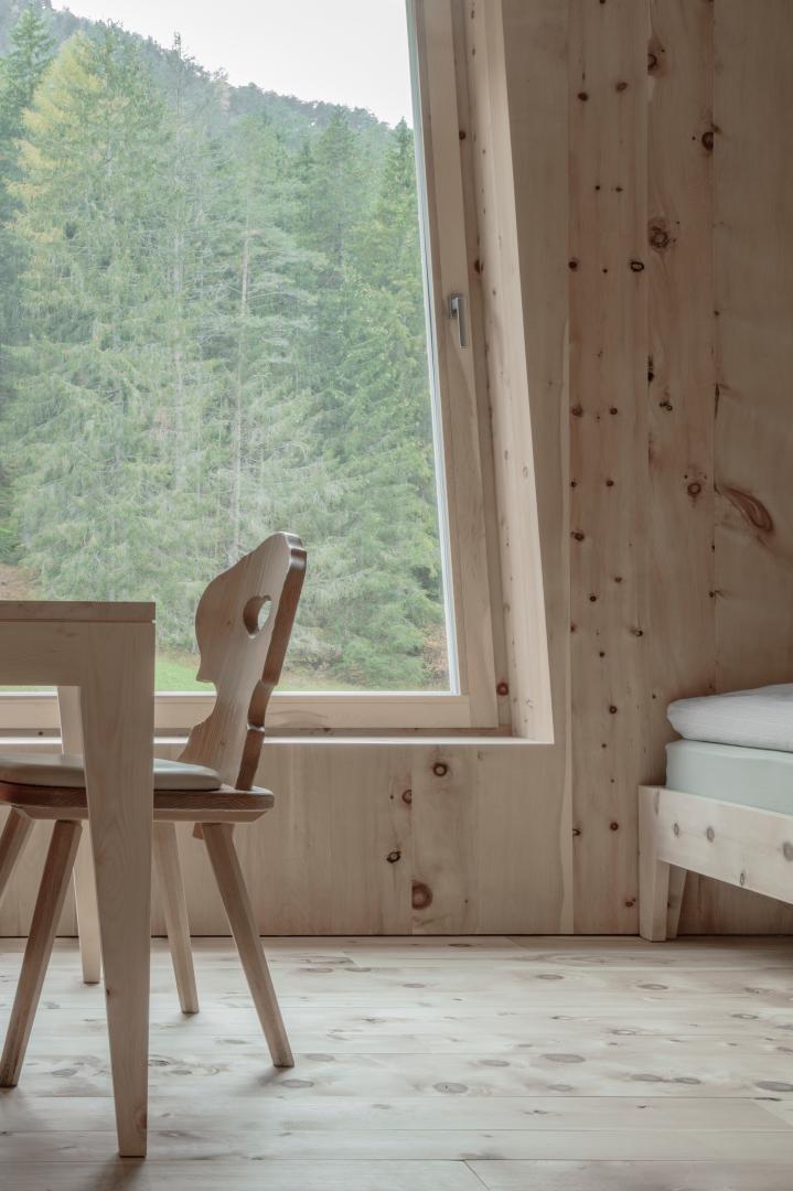 The three overground floors are entirely made from the wood that fell on 30 October 2018 during heavy storms in the surrounding forests. Massive spruce wood was joined to create the exterior and interior walls, using a special technique and avoiding the use of insulation materials, adhesives and resins. Even within the prefabricated building components, the planks were layed in the same way as the tree had grown - from bottom to top. On the inside, the surface consists of solid and hand-planed stone pine wood. Because of its warm colour and characteristic smell, which gives the room a feeling of well-being and warmth, the stone pine has been used in local tradition for many centuries as interior lining of the parlour. Like a pine cone, the façade is clad with hand-split larch shingles.