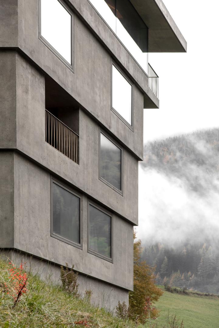 Just above the center of Gossensaß village (1,100m), the residential house of a young family was built from insulating concrete. The tower-like shape gave the house not only a small footprint but also ground-level accesses on both the lowest and the top floor. The structure of the certified low-energy house has grown out of the ground at its very location and is firmly rooted to it. The monolith's 75cm thick walls combine all the functions of the façade in just one layer: protecting, insulating and supporting. Targeted views of the mountain landscape are revealed through precisely focused openings, with deep jambs becoming spatial elements in their own right, used for sitting, resting and observing in everyday life. At its core, the house is accessed by a compact spiral staircase. The top floor, which is up to 6 meters high, forms the open living area. A circumferential window band allows to enjoy an unobstructed panoramic view. Diamond-shaped concrete slabs for the roof and wooden shingles for refining both entrances were manufactured in traditional ways. The entire building envelope is designed to be monochromatic. Natural, grounded materials define the image inside as well, creating a down-to-earth and comfortable indoor atmosphere. Untreated fir for flooring, windows, doors and furniture, handcrafted terrazzo surfaces, handcrafted lime plasters, and burnished brass matched to the color of the concrete as well as handcrafted glass make the rooms stand the test of time.
