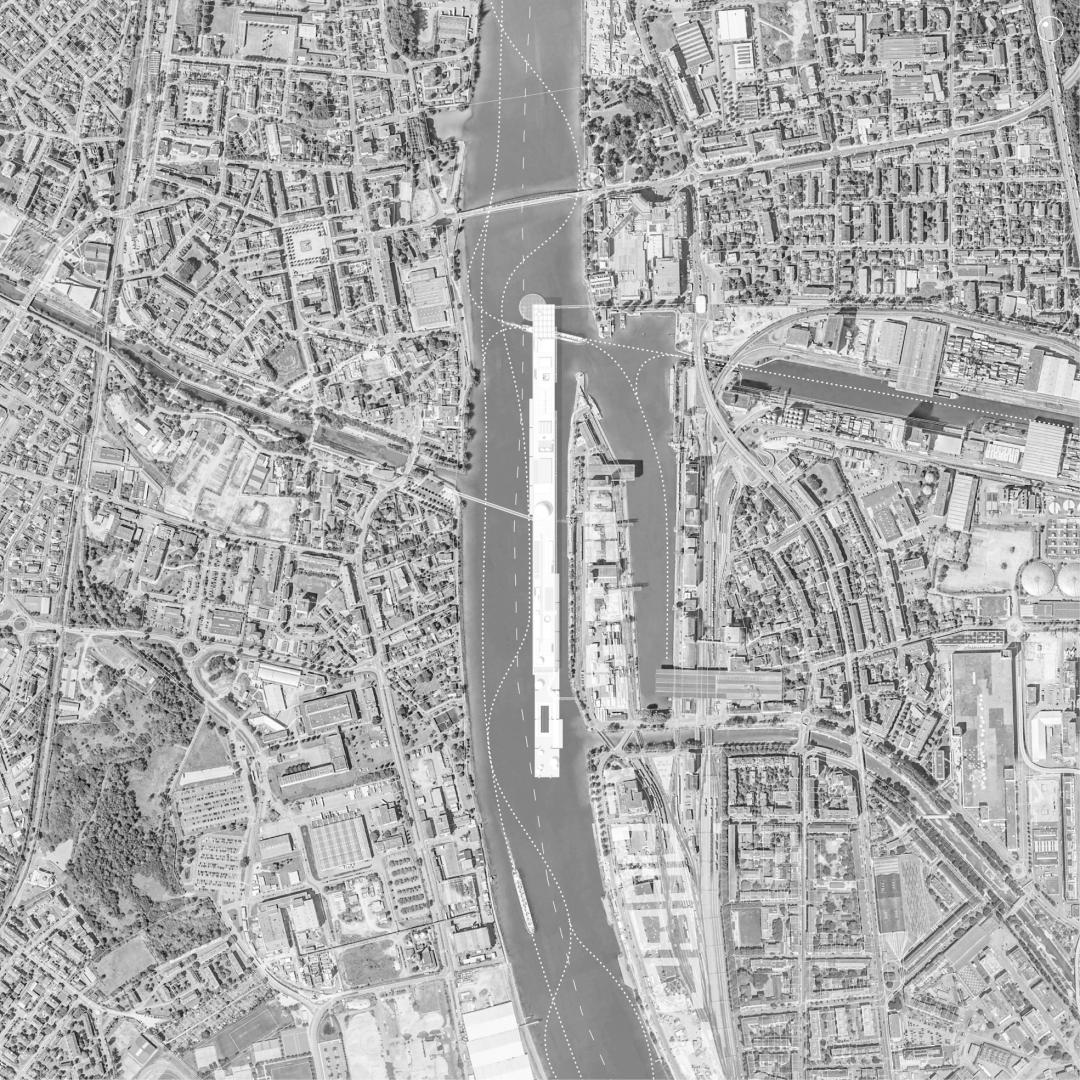 Composed of a floating level, a built thickness and a roof terrace open to the city, the architecture reveals, materializes, and allows us to inhabit the border, by strategically implanting itself on the Rhine, to reveal, mask or enhance the architectural and urban heritage present on the banks. To those who see in the project a boat, we counter that it is architecture. To those who seek architecture, we will speak of boats. Nevertheless, this new public space, which does not belong to any of the three countries, reflects the scale of the context, facilitates the crossing of the river and tries to reinforce the feeling of belonging for the inhabitants.
