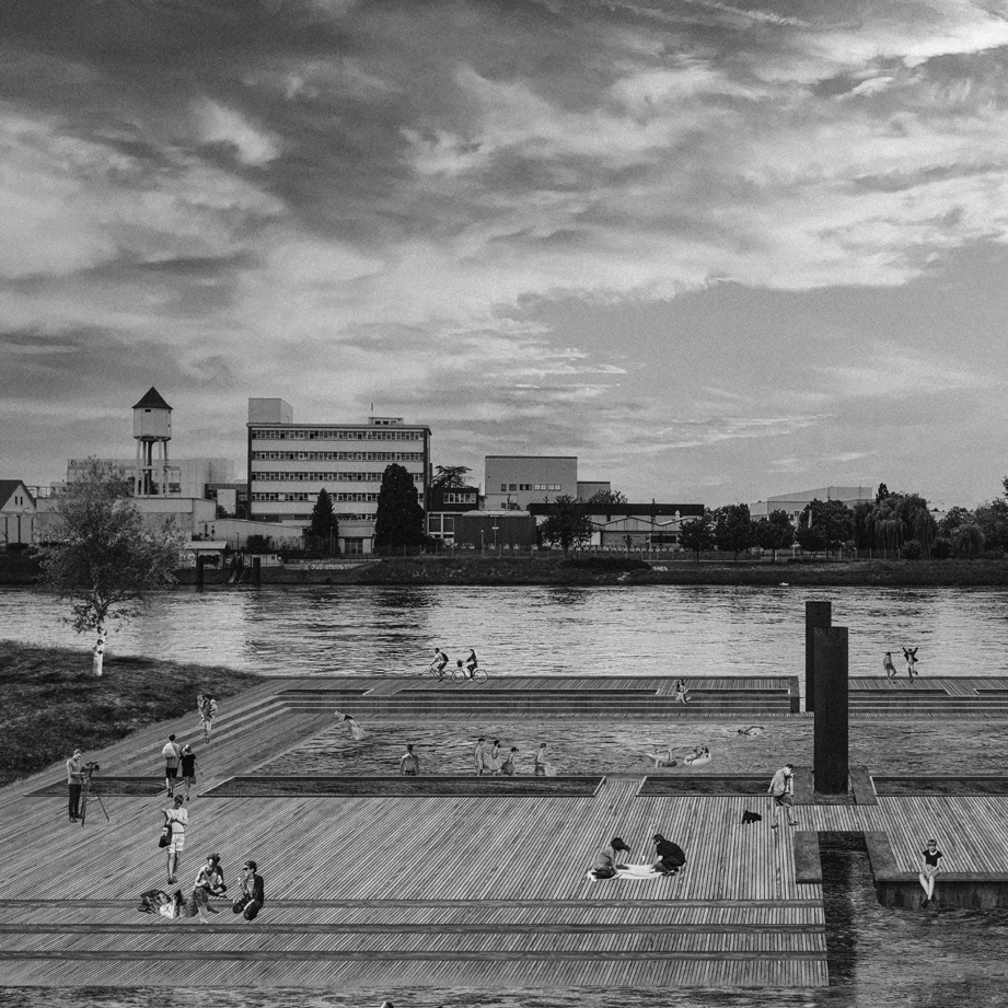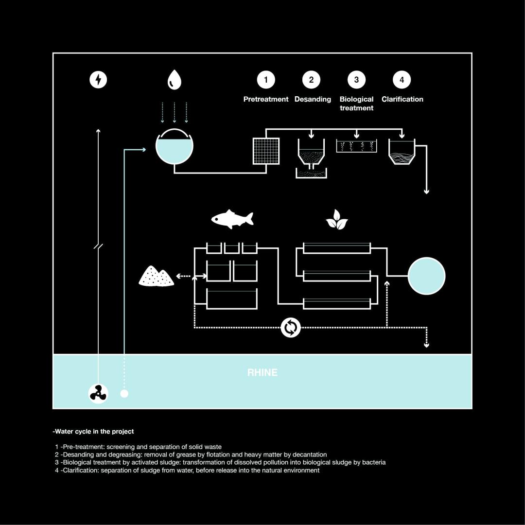 The foundations of the concept are largely based on the notions of sustainability and circularity. The quality and use of the water resource is the starting point of our thinking, and this is the basis for the choice of programs and their relationship: a water machine, capable of filtering the Rhine. This programmatic synergy is made possible by man, but it is above all imagined for him. Indeed, the natural cycle of water, its accessibility, as well as its use, condition the habitability of the territory. Production, protection, and leisure are intertwined. The effervescence that emerges from these interactions is the desired result of a resilient micro-system, integrated into the local ecosystem.