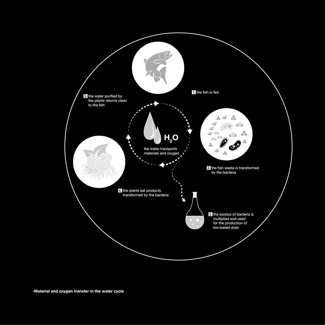 This first part of the program is accompanied by aquaculture production, taking advantage of the rich nutrients released by the fish, while ensuring natural water purification. This reinterpreted culture allows for continuous plant production without chemical inputs and with 90% less water consumption than soil-based cultures. The production of bio-based pigments completes this productive ensemble, echoing past industrial neglect that has greatly polluted the water system on a large scale. Reconstituting this knowledge and adapting it to current issues shows that it is possible to renew oneself from one decade to the next, and to reinvent oneself from one century to the next without disregard for the past.