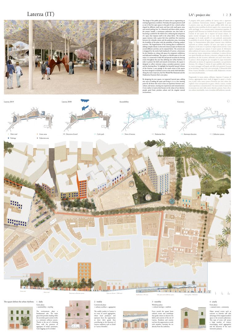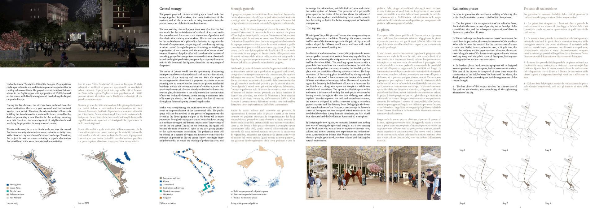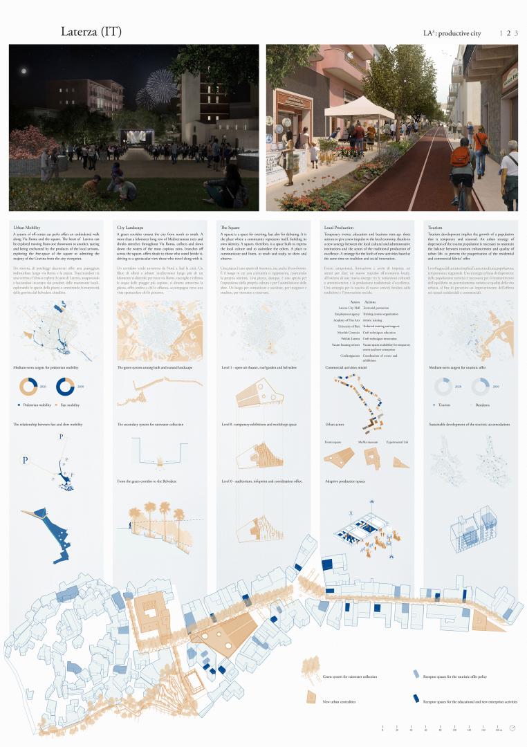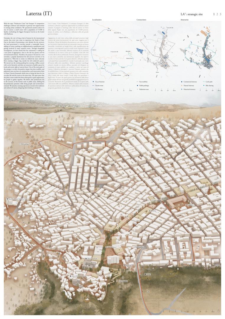 Under the theme “Productive Cities”, the Europan 15 competition challenges urbanists and architects to generate opportunities in existing urban conditions. The project is about the city of Laterza: a town in the Puglia region with a population of 15.000, located on the border with Basilicata region and overlooking the largest canyon in Europe. During the last decades, the city has been excluded from the main destinations that every year national and international tourists come to visit. Therefore, the administration of Laterza is building the foundations for a sustainable future, moved by the desire of promoting a new identity for the territory: investing in artistic locations, the redevelopment of neighborhoods and involving the population in many seasonal events. Thanks to the analysis on a territorial scale, we have discovered that the community wishes to have a new center for sociality, close to the historical city and a beautiful natural landscape. Therefore, the project focuses on a new centrality: a popular destination that could host, at the same time, old and new activities.