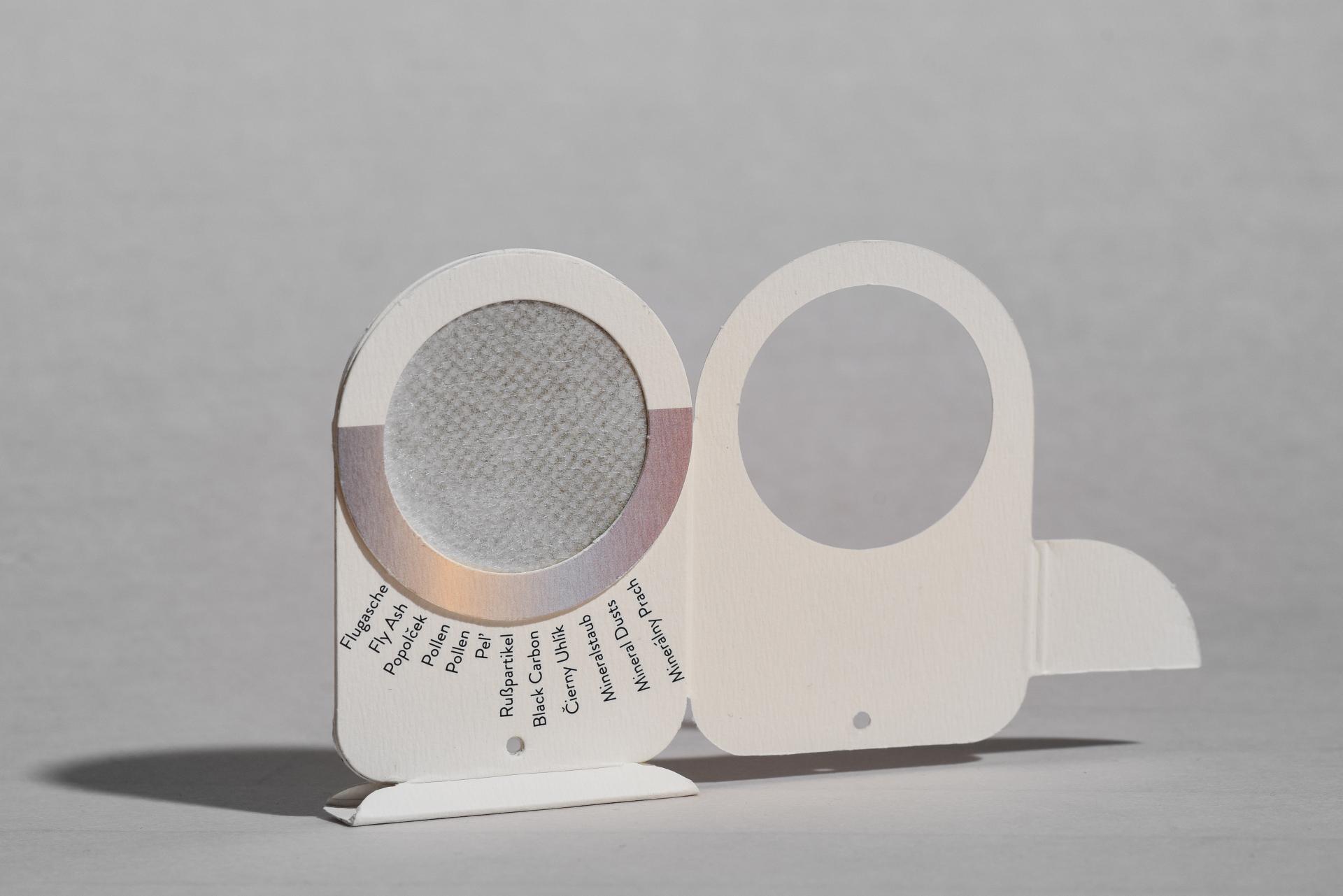 Dusts Catcher Kit is a simple, foldable and fully recyclable tool for collecting and materialising airborne dusts. The nanofabric inserted into the folding paper device materialises the particulate matter by collecting dusts particles from the environment and it transforms otherwise invisible airborne dusts into visible and tangible aesthetical objects.