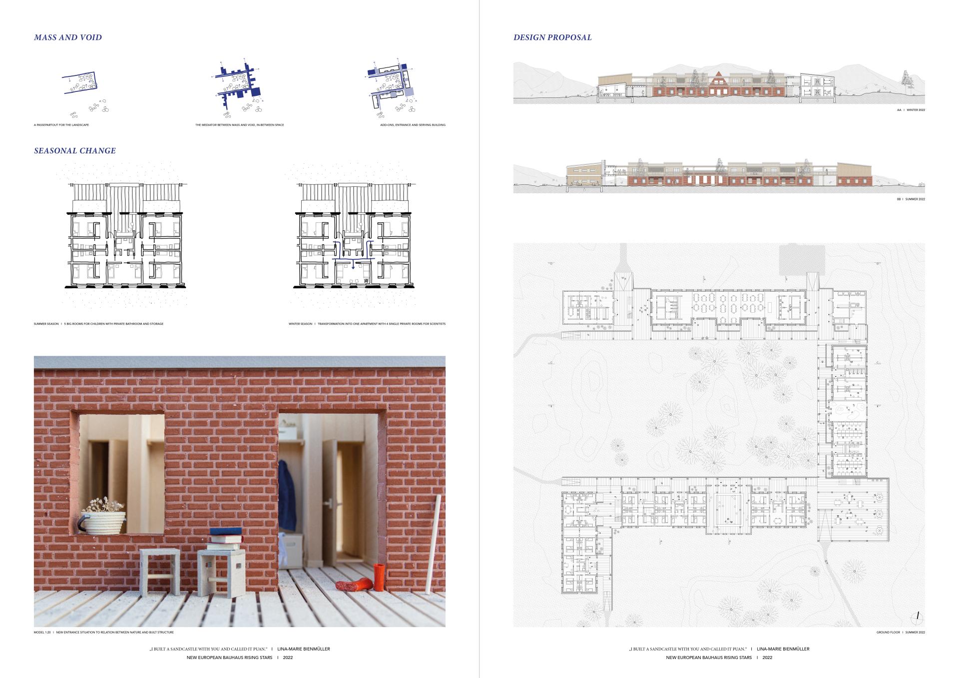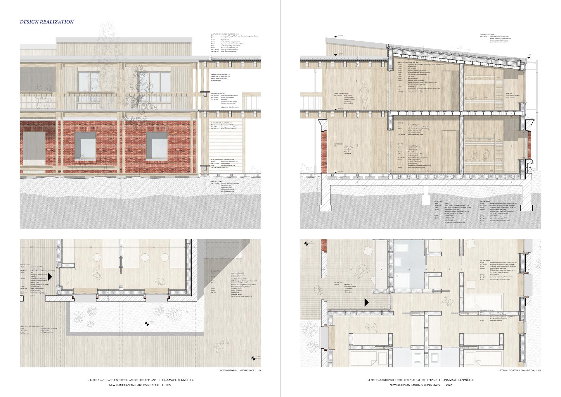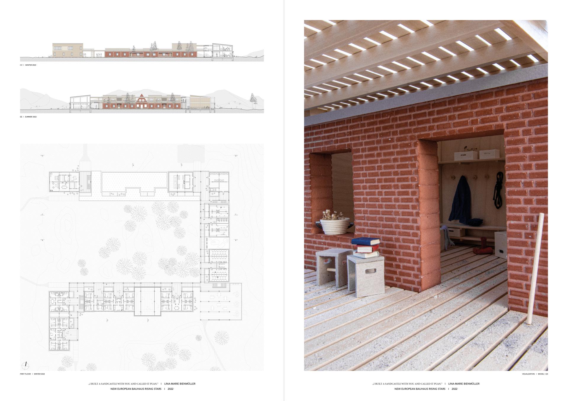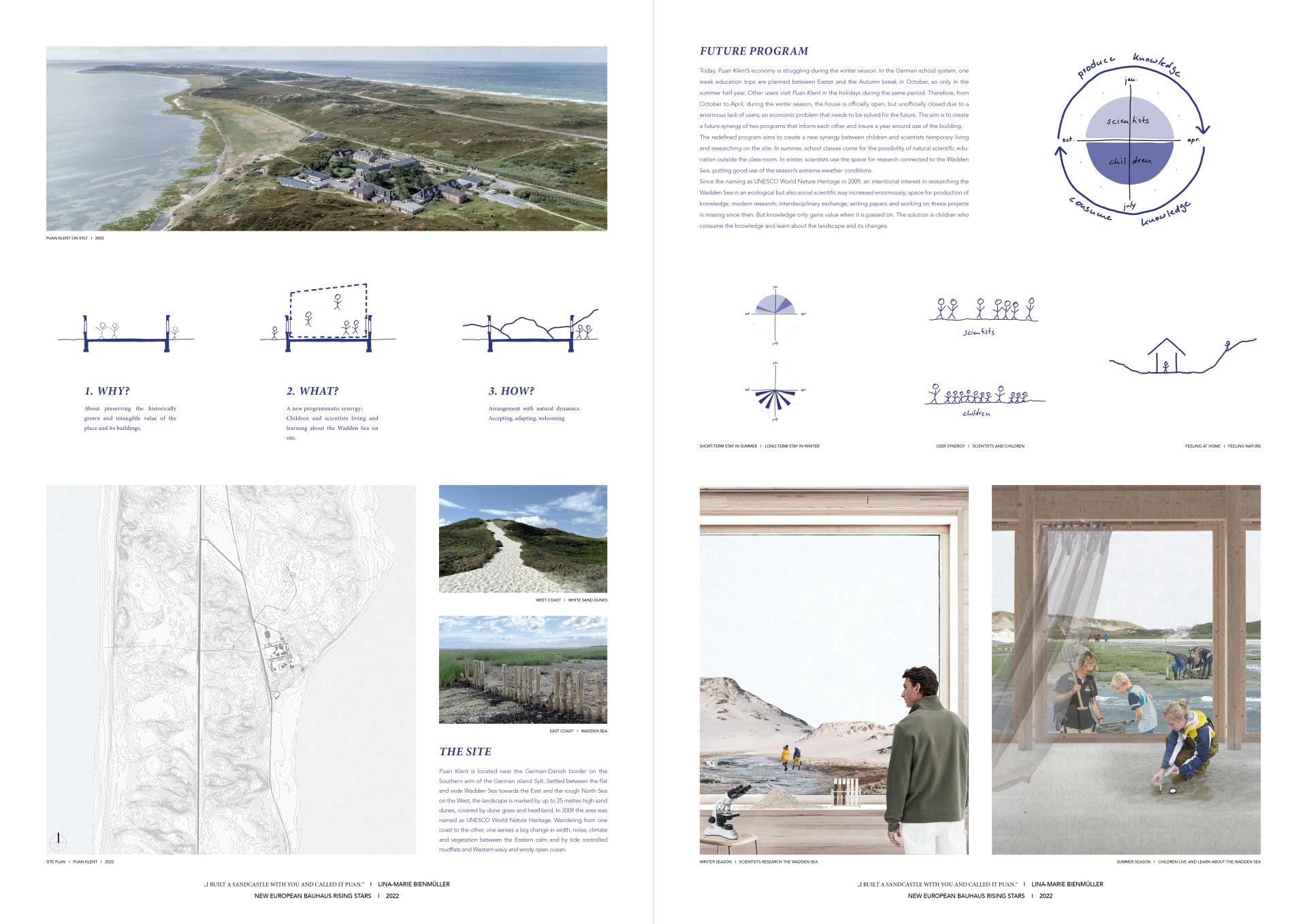 The project finds its roots in the acute need for a programmatic and architectural redefinition of the 100 year old Youth Meeting and Education Centre Puan Klent on the German island Sylt. It thereby aims to create a new synergy between children and scientists temporarily living and researching on the site, located within the UNESCO World Nature Heritage area of Wadden Sea. Their commonality is the demand to both feel at home and feel nature, whereby the space and program change and adapt to the two different seasons. Due to the institution’s close connection to the city of Hamburg, the existing brick walls carry more than a structural significance. It is about preserving the historically grown and intangible value of the place while adapting to an alternative treatment of nature that is necessary to ensure the survival of the island in climate change. In order to offer the potential to one day dismantle the human built structure and allow nature to take over when the traveling dunes arrive at the site, reflected thoughts and decisions about the choice of nature based materials and their construction and joints carry the proposal all the way into the detailed level of scale.