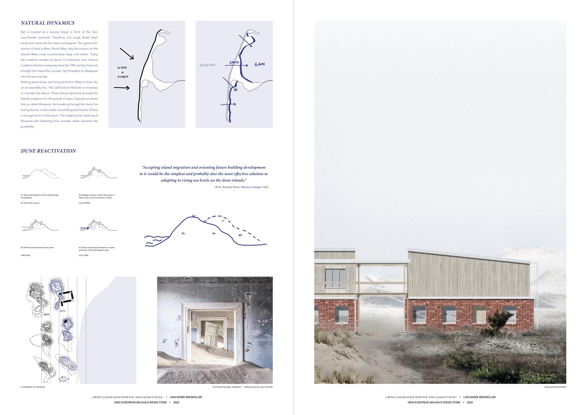 The quote by the German marine ecologist Prof. Karsten Reise highlights the concept for environmental sustainability of the project: Re-activating the natural movement of sand dunes to ensure the survival of the landscape in climate change and consequentially reflecting and adapting the planning and building process but also the use of the built structure to the building's new possible timeline.