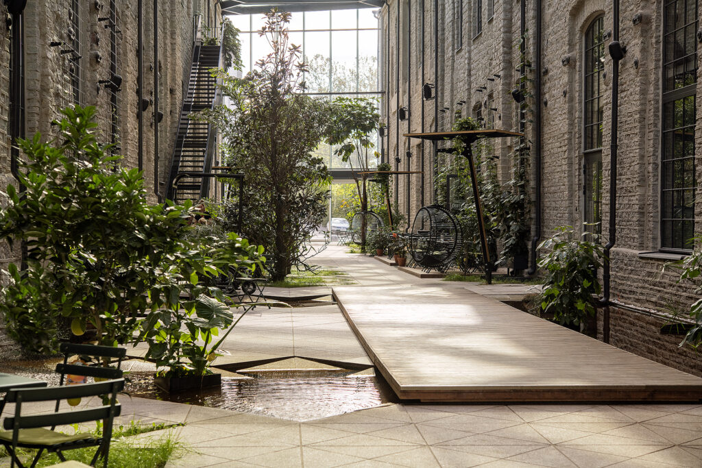 The wailed up historical street in Fahle Quarter has been given new life as a green gallery with a protective glass roof. The sturdiness of limestone walls is offset by slender steel. The roof construction inspired by the Art Nouveau industrialstyle is covered with solar control glass. The offices, shops and restaurants with terraces opening to the green oasis of the gallery. Light, airy and steel, the furniture is similary in green hues to give it a street-like feel. The details suggesting an outdoor and park-like ambience obscure the line between indoor and outdoor life and create a perculiar gallery atmosphere. It has quickly become peoples favourite spot for taking pictures.