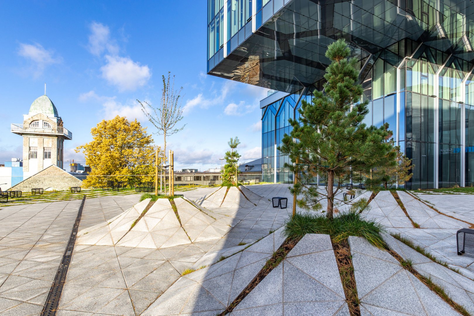 The design of the landscape for the gallery street is based on an unusual concept that creates a feeling of nature breaking into urban space.