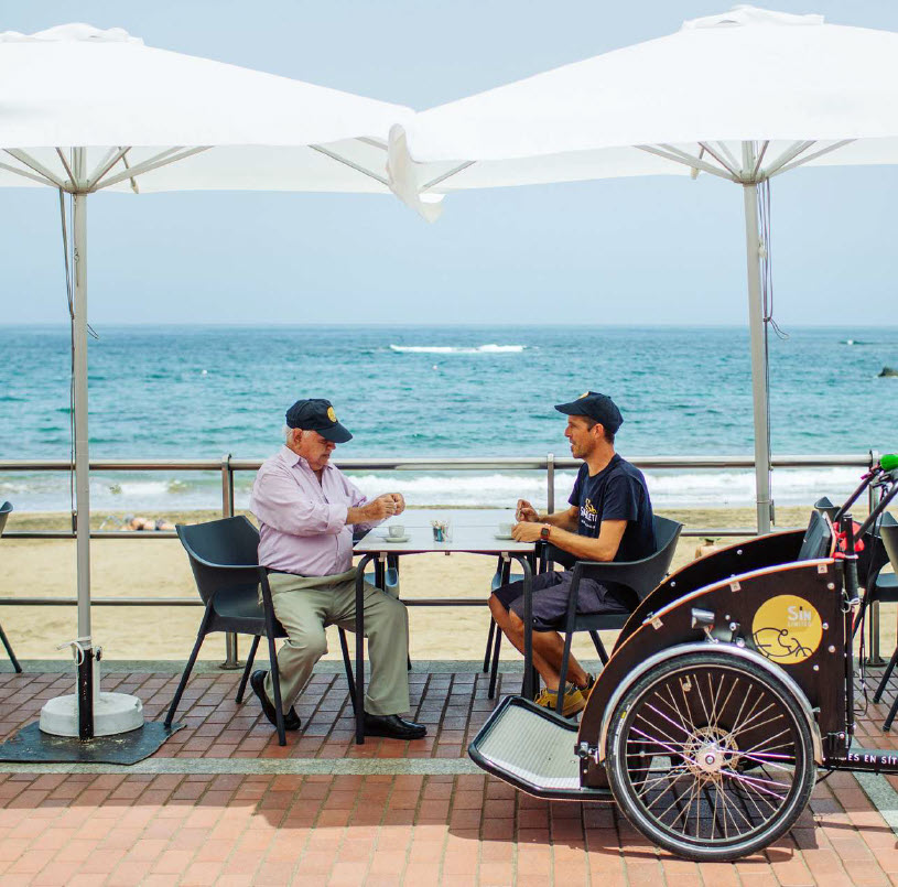 Sítycleta Sin Límites (Sítycleta Without Limits)is a volunteering service of tricycle rides for the elderly and people with reduced mobility in the city of Las Palmas de Gran Canaria.It aims to reconquer public space providing them the sensory experience of riding a bike, the most agile and happiest means of transport in cities as it allows us to move at a slow pace, attentive to the dynamics that arise around us along the route.It's made possible thanks to the volunteers who drive the tricycle.