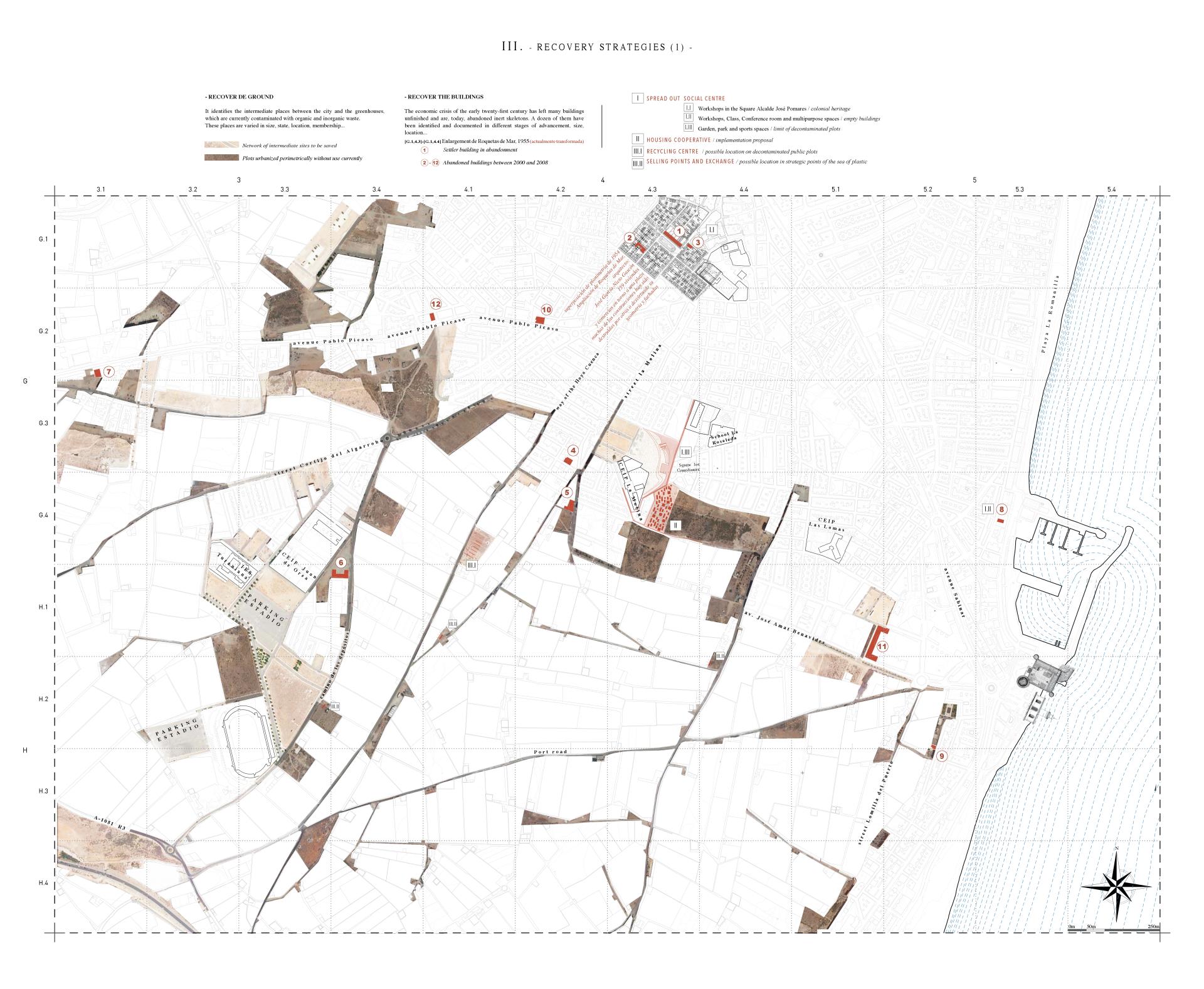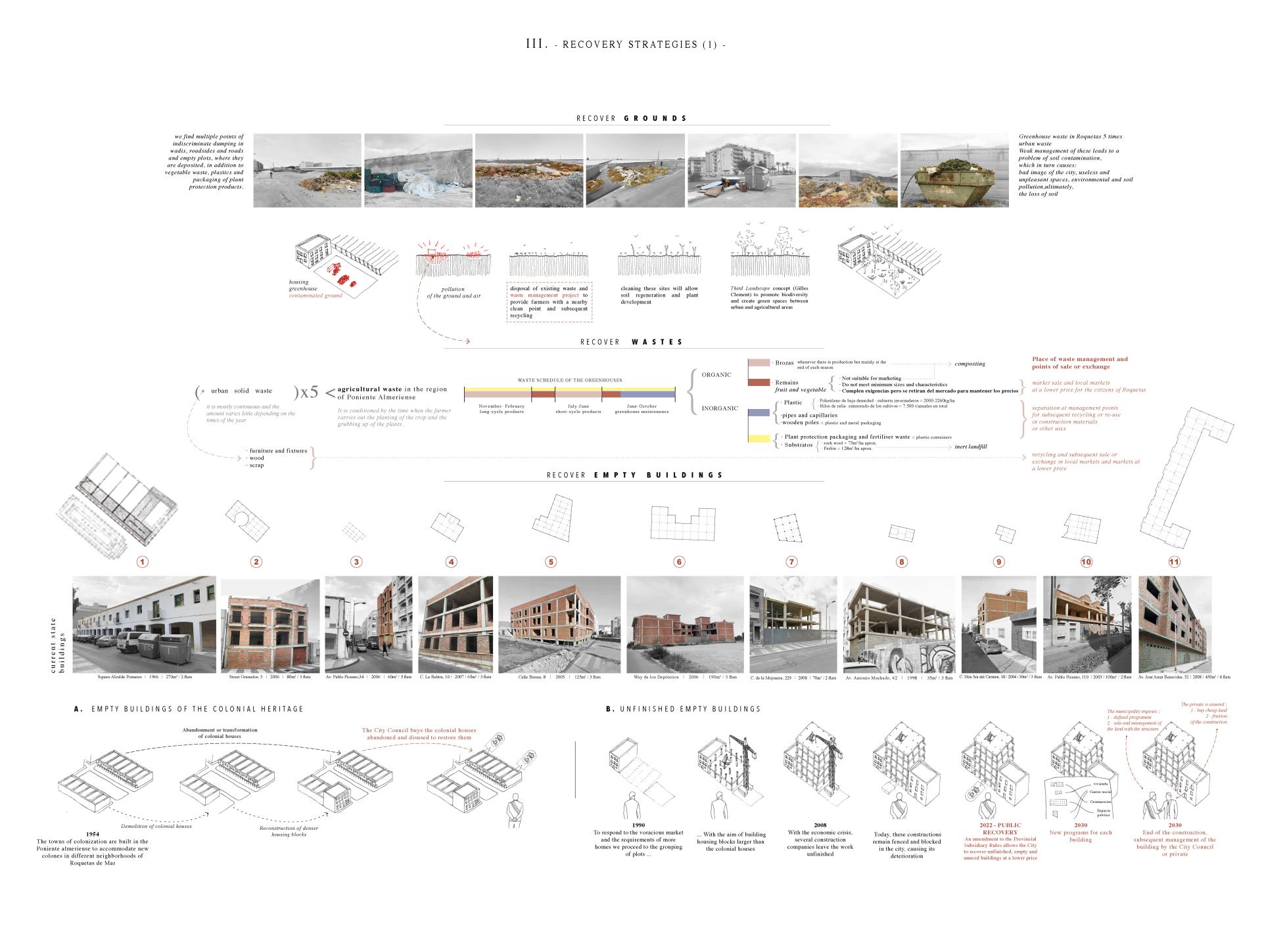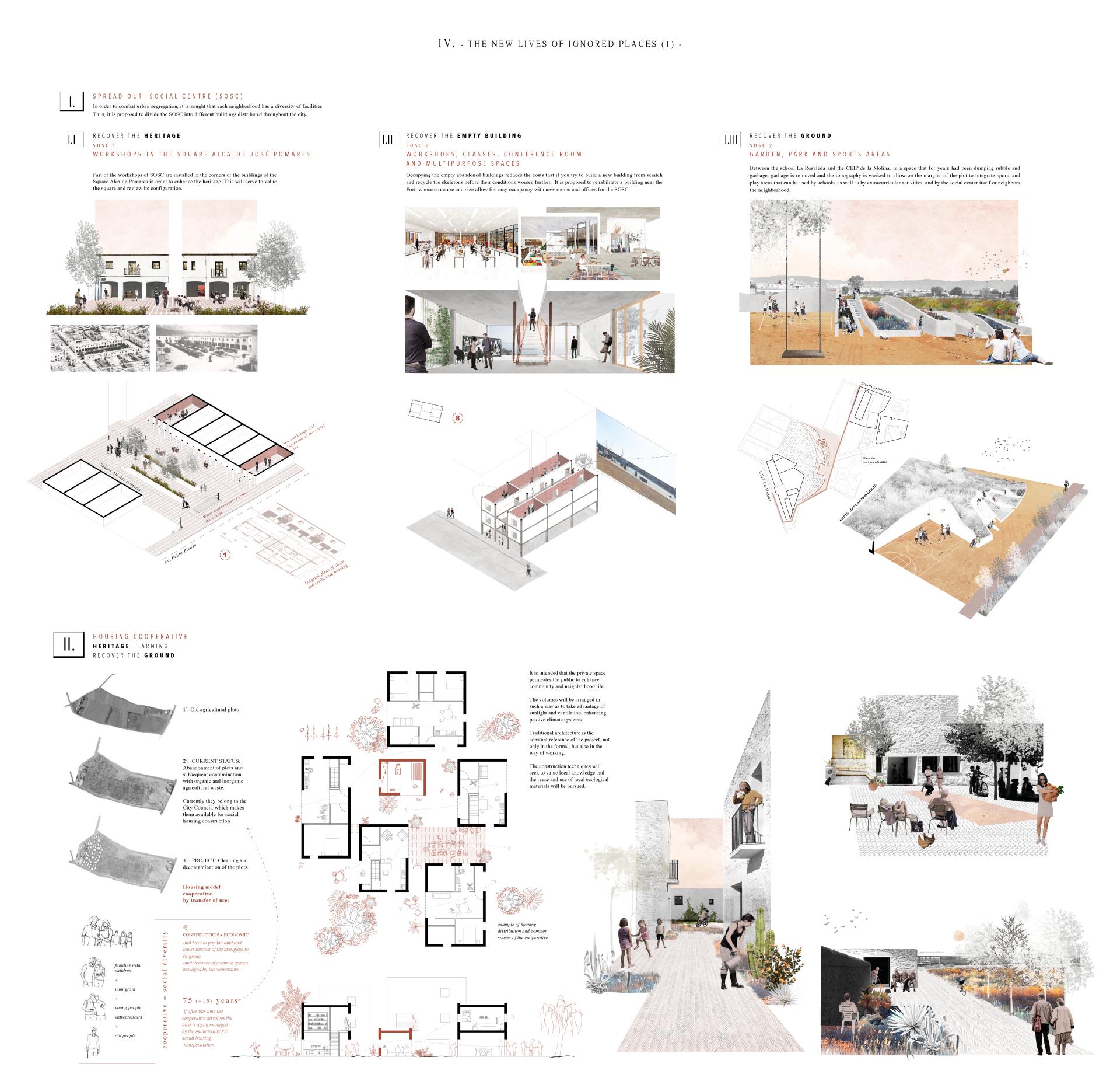 The project is based on the transformation of the unused and unfinished buildings found in Roquetas. This reparation will permite to the City Council to save the costs of erecting new buildings and prevent these abandoned buildings from harder degradation. Each building is able to adapt itself to a program. For example, colonial building offer large spaces that are ideal for workshop; concrete building will be rehabilitated, whose structure and size will allow to be easily adapted to rooms and offices for the IIC Finally, in a space where debris and garbage have been pouring for a long time, we propose to clean and work the topography to integrate into ita sports area and playing ground in relation with the street