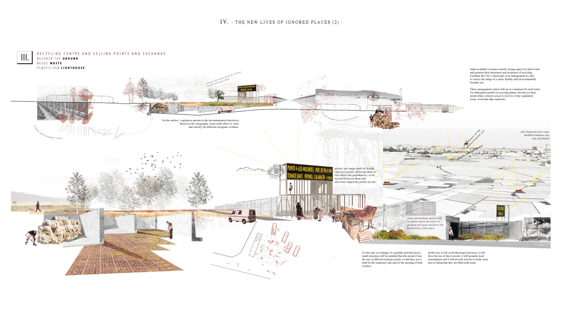 We identify intermediate sites between the city and the greenhouses, which are currently contaminated by organic and inorganic wastes from agriculture and urban life. This dirt of the territory not only causes a bad image, but also causes odors, stops plants development and pollutes the soil and air. The release of the soil will allow its decontamination and these intermediate places will become green spaces that will bring new biodiversity to the territory. Those planted places are considered as a third landscape : without doing nothing, a process of auto-regeneration of the plants and the soil will start on its own.