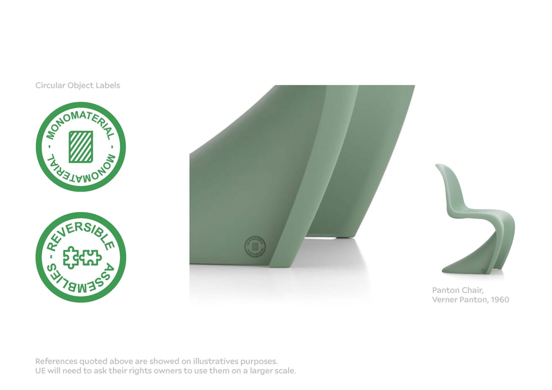 The Circular Object Label is a European label associated with conception and manufacturing techniques linked to existing sorting, recycling facilities or technically, economically and locally accessible. Both Möbius Stripe and The Circular Object Label would coexist as two different commitments levels more or less supportive.
