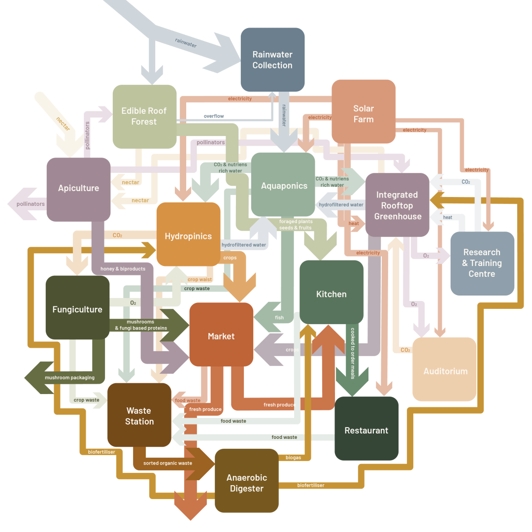 With EU's level of urbanism set to increase to 83.7% by 2050 the challenge of providing food to everyone in a sustainable and efficient way is of paramount importance. For millennia humans have farmed the land for food but with the sharp rise of the population, as a result of the industrial revolution, the pressure on traditional agriculture has exponentially increased. More than 49% of EU's land is used for agriculture. That results to (in) environmental challenges ranging from habitat clearance to biodiversity loss and soil erosion that in turn put extra pressure on agriculture. Added (to) these challenges are a changing climate with the disruption of the seasonal weather patterns and the lack of suitable soil in the vicinity of the expanding urban centres. The solution we see to that problem is the creation of highly densified urban agriculture centres, inside the existing urban infrastructure, that will condense the sprawling agricultural land to much smaller factory-like sites with optimised conditions and increased yields. By optimising the space and diversifying the produce, those centres can be located in a vastly smaller site in the city centres resulting not only in the creation of more space for nature and local ecosystems to take over but it also eliminates the CO2 emissions generated during the transport of food. The controlled environment created in these centres lifts all environmental pressures and thus eliminates the need for pesticides and fertilisers. At the same time the creation of closed water cycles supplied by rain water harvesting systems not only eliminates any water consumption but it also protects our urban areas from the extreme rainfalls caused by climate change. Finally the reuse of agricultural waste as a source of biogas and the combination of edible green roofs with solar panels creates a closed circular system able to function completely self-sufficiently at all times.