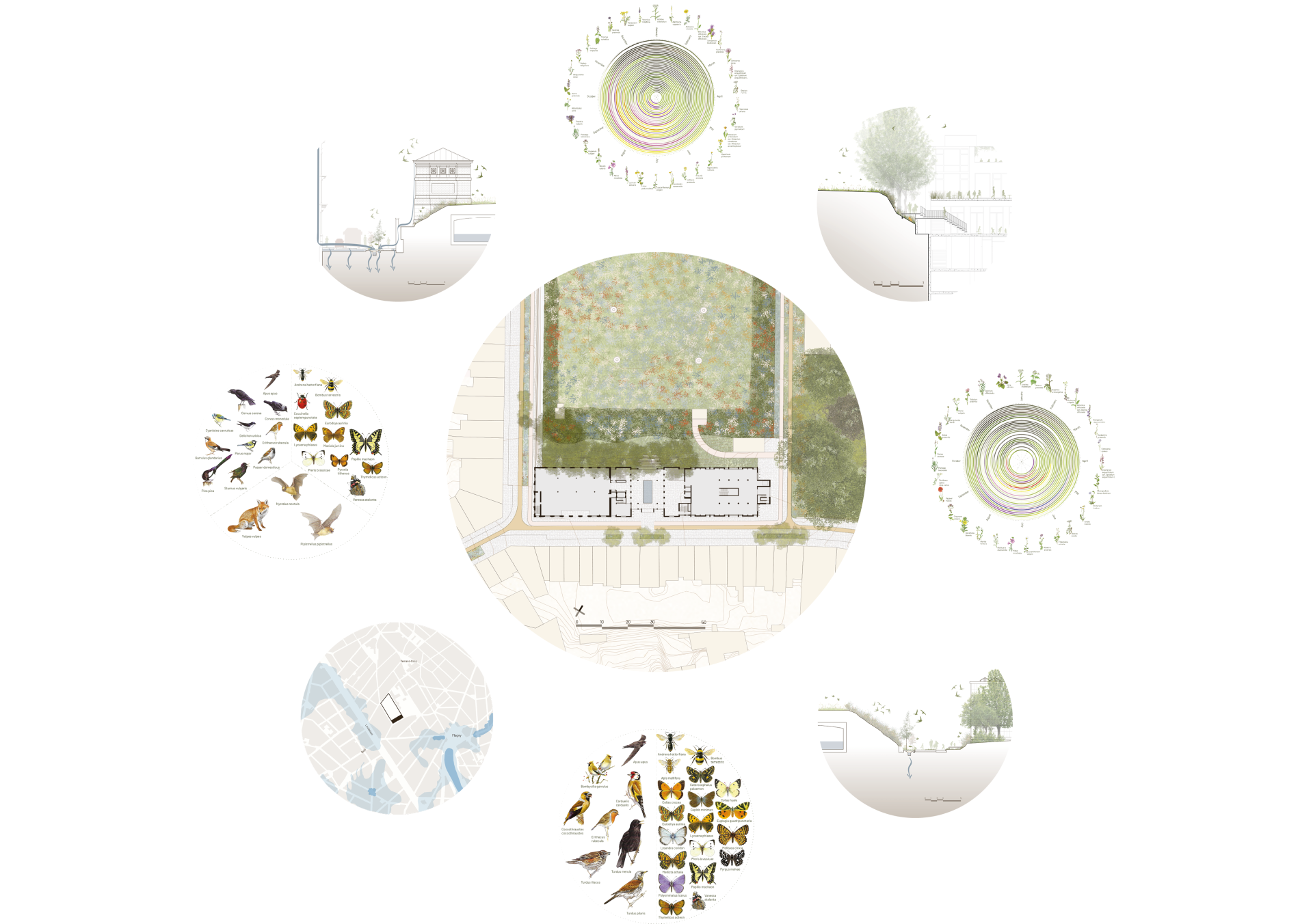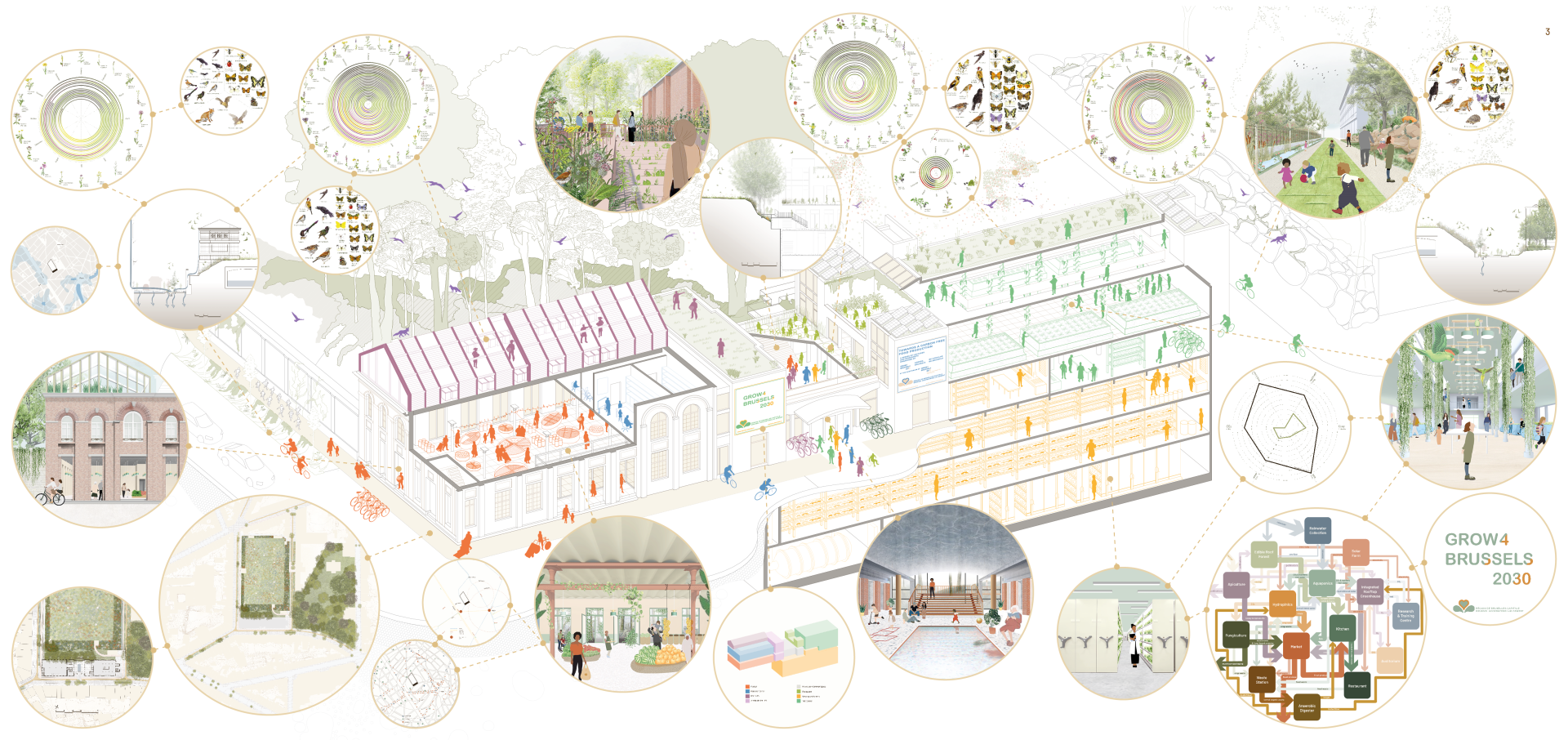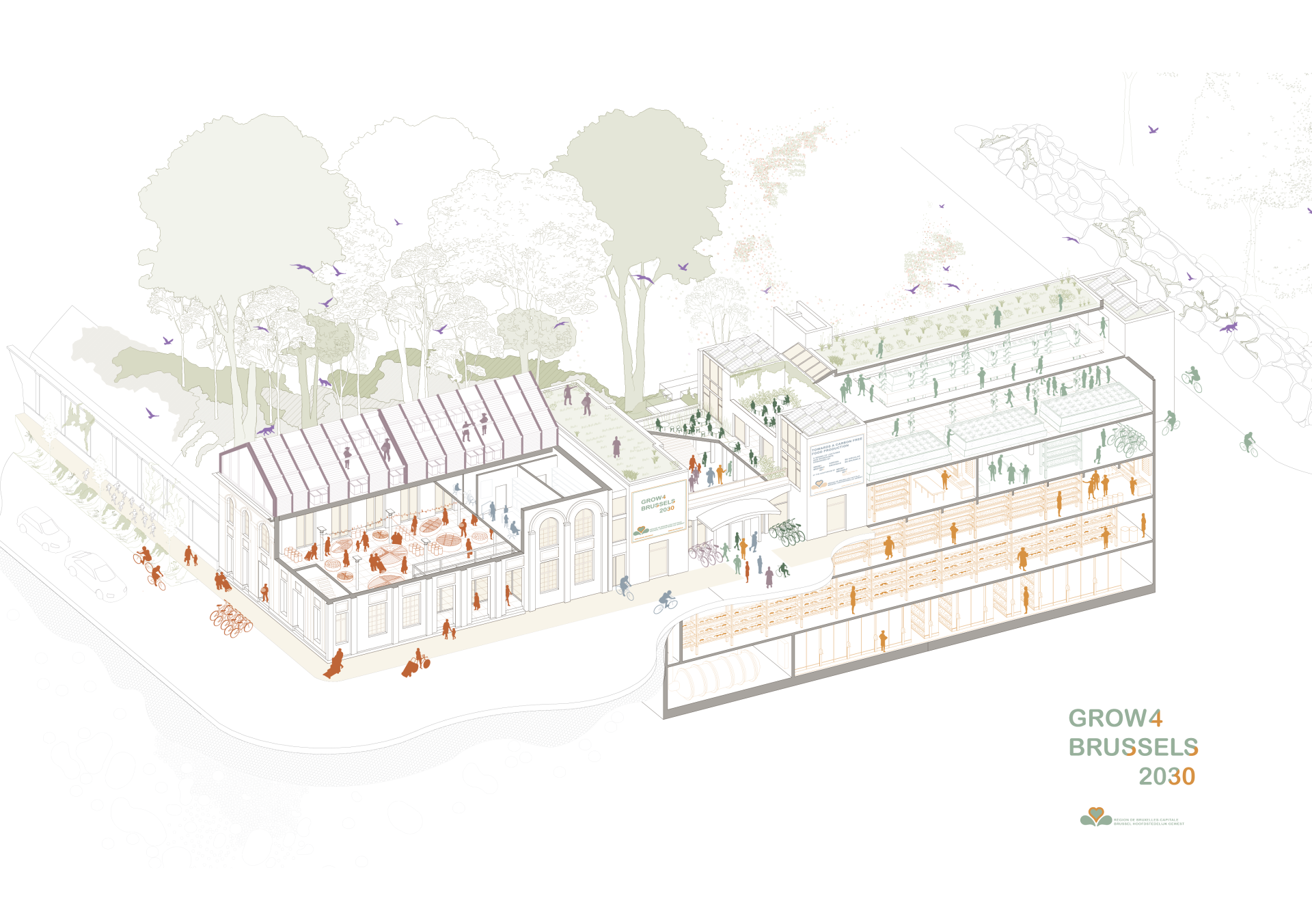 How can a historical building help pave the way towards a climate and economic transition aligned with the regional objectives related to direct and indirect greenhouse gas emissions by 2030? How can an initiative of this scale function as a catalyst for rethinking spatial planning and the relations between production, public facilities, economic activity, leisure and green spaces? 'Grow 4 Brussels 2030' initiative aims to not only help the Brussels Capital Region to strengthen its commitments as included in the NECP (National Energy and Climate Plan) and raise the objectives of the European union, but also spearhead the transition towards a circular and regenerative economy with focus on social and democratic entrepreneurship and the respect of the urban ecosystems. For those targets to become reality, a seemingly complex yet quite simple holistic approach was drawn ,transforming the former museum complex of CIVA to an integrated centre of food production, agricultural entrepreneurship, research, training, education and preservation. The once conceived as an enclosed and egocentric space, that will be left empty after CIVA moves to its new location, gets the needful porosity to create the ideal conditions both for nature and the local population to come and reactivate the building with a multitude of different activities.