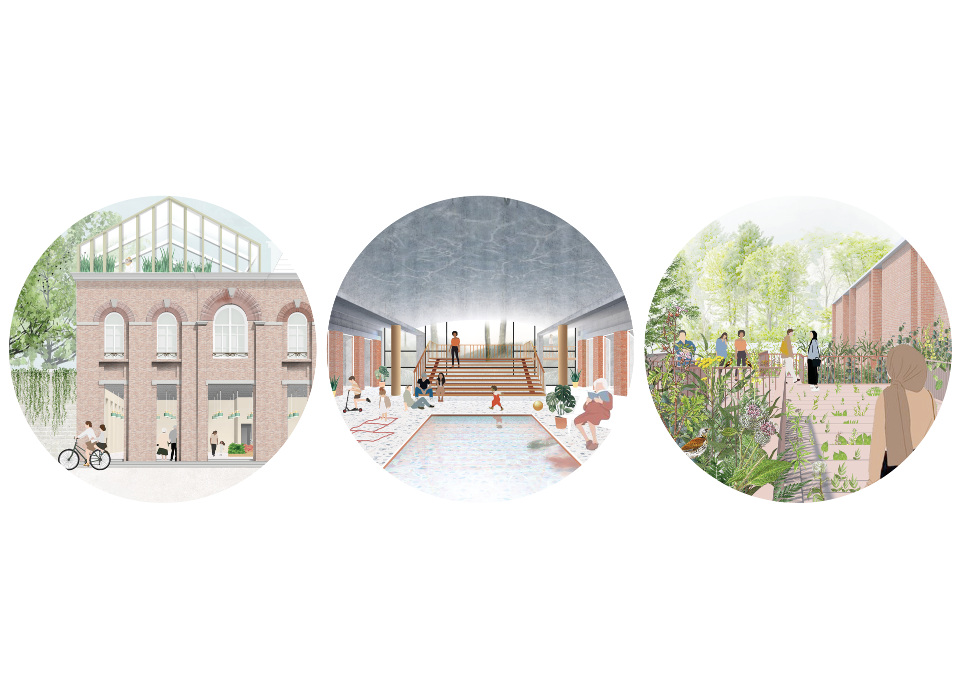 When called to deal with the renovation and reprogramming of a building with not only historical value but also dominated by a very specific architectural vocabulary formulated to host one and only one use, one might feel timid. When on top of that there are added budget restrictions, regulations to be followed in regard with high security areas and a very diverse neighbourhood, the pressure becomes even greater. In order to help us with our design process we created for the very beginning a list with our core values that must become an integral part of the new design. This list was focused on the terms of circularity, environmental sustainability, social inclusion, affordability and high-quality user experience. The re-programming of the vast subterranean surface of the building, that stretched over 3 levels and was packed with build in storage equipment, was inspired by the local tradition of using the basements of the city houses for the production of the Belgian endive, was the springboard for the reprogramming of the entirety of the complex and its surrounding space and the creation of "Grow 4 Brussels". The urban farming and urban fish farming which have found their roots in the area since the Middle Ages are now coming to breathe new air to the neighbourhood. Oriented around the production of, sustainably grown and high nutritional quality produce a multitude of other programs come to nestle in the existing built environment. An agricultural research and innovation centre creates links with the, somewhat, financially struggling students at the neighbouring schools and a restaurant and visitors centre creates connections with the local community and the urban population while playing an educational purpose. Finally green spaces, championing the native flora, are created, engulfing and restoring a multitude of ecosystems, from meadows to forests and boggy areas. That synergy between all different elements is the one creating an outstanding condition in the city