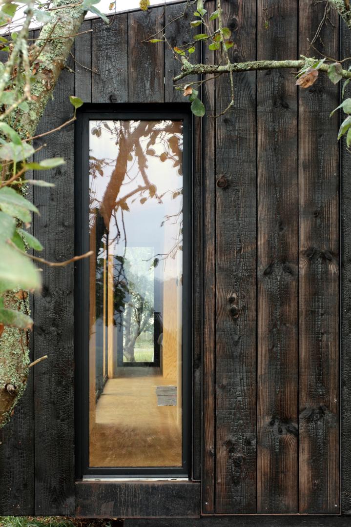 The wood species are local and of controlled origins. The Douglas pine cladding boards are burnt to protect them against insects and bad weather. This deep black is reminiscent of the cabins of regional tappers. Its prefabricated and artisanal production at the same time, allows a quality of construction which combines requirement of the details and respect of the deadlines.