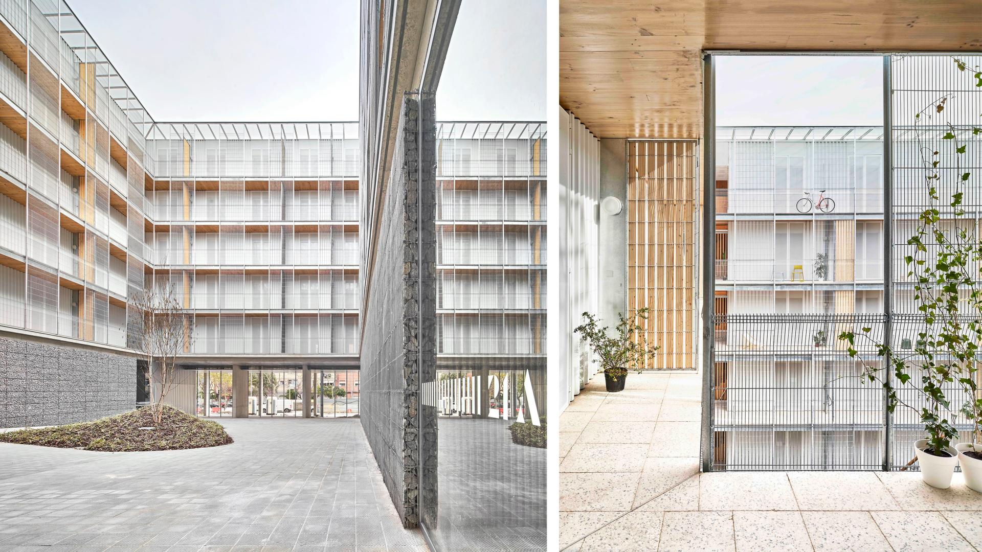 The facades have two layers: a first layer formed by a ventilated facade of load-bearing wall of cross-laminated timber CLT with a white lacquered fret-shaped profile exterior finish (to maximize reflection); and a second, outer layer, formed by a folded electro-welded mesh forming a railing and a set of elements that are added depending on the needs. This sum of layers ensure a changing building image depending on the position and the sunlight influence.