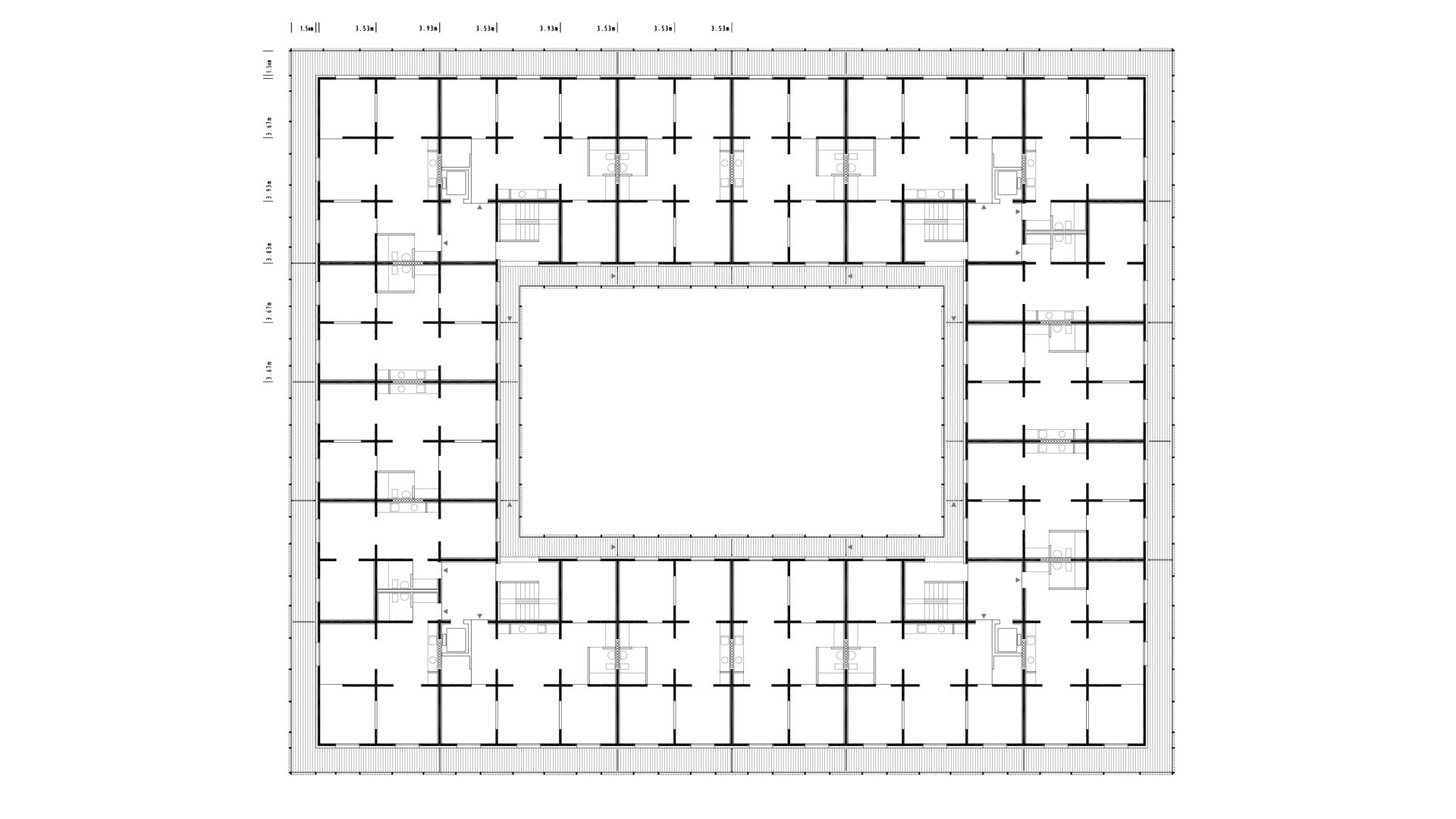 The building’s general floor plan is a matrix of communicating rooms. There are 114 spaces per floor, all of similar dimensions, eliminating both private and community corridors to make the maximum use of the floor space. The server spaces are laid out in the central ring, while the rest of the rooms, of undifferentiated use and size (13 m2), accommodate different forms of occupation. Another terrace in the outer ring completes the spatial sequence: an enfilade of spaces interconnected by large openings, permeable to fresh air, the gaze and movement.