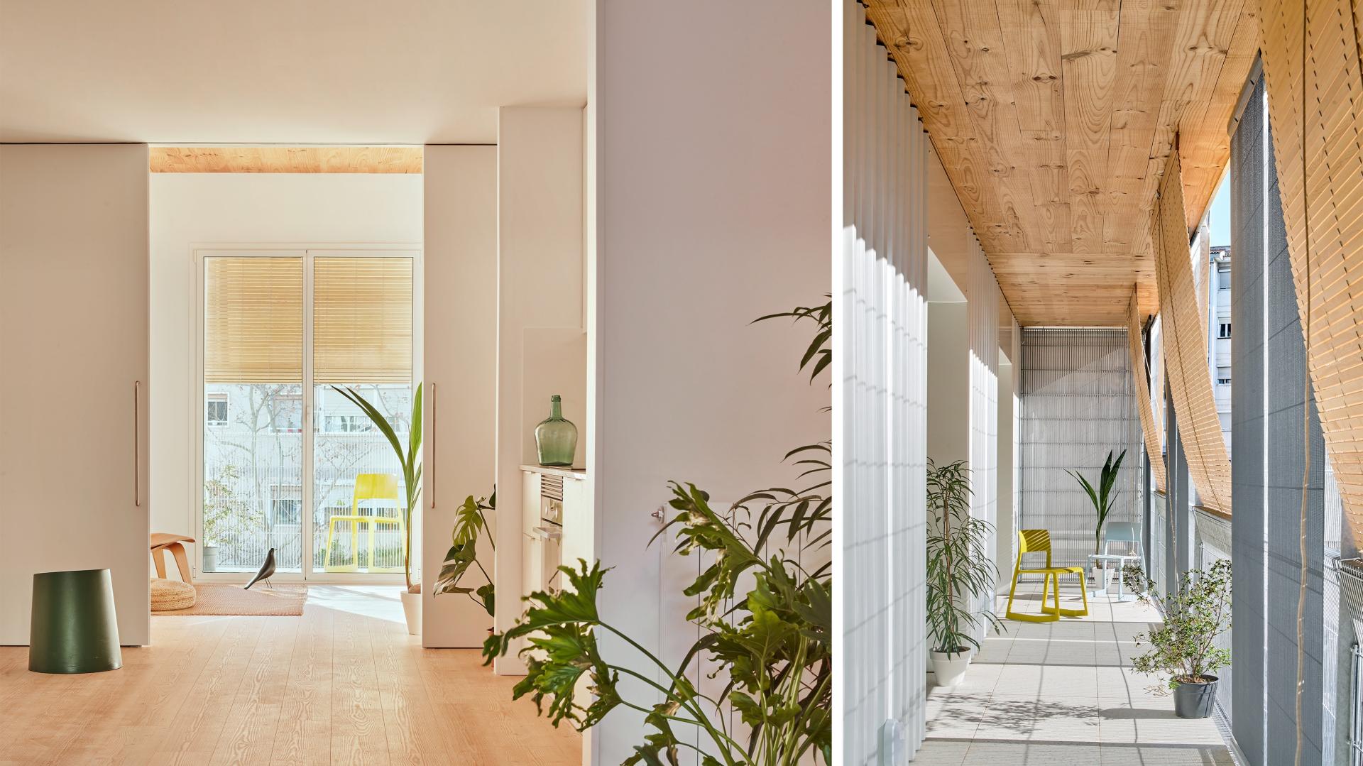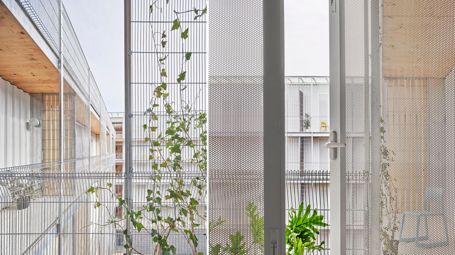 The two perimeter terraces are like an overhang for sun protection. The exterior building skin is built up with electro welded wire mesh with a shading mesh of 28% porosity. This coating works at the same time as protection of the solar rays that can affect the interior facade and as for the visual protection and privacy of the exterior use of the terrace on the visuals of the neighbors. In parallel to this mesh, the Barcelona shutter is placed, acting as solar protection and lighting control of the holes in the houses. This sum of layers on the facade creates a shade on the outside terrace that allows the outside temperature to be reduced by several degrees.