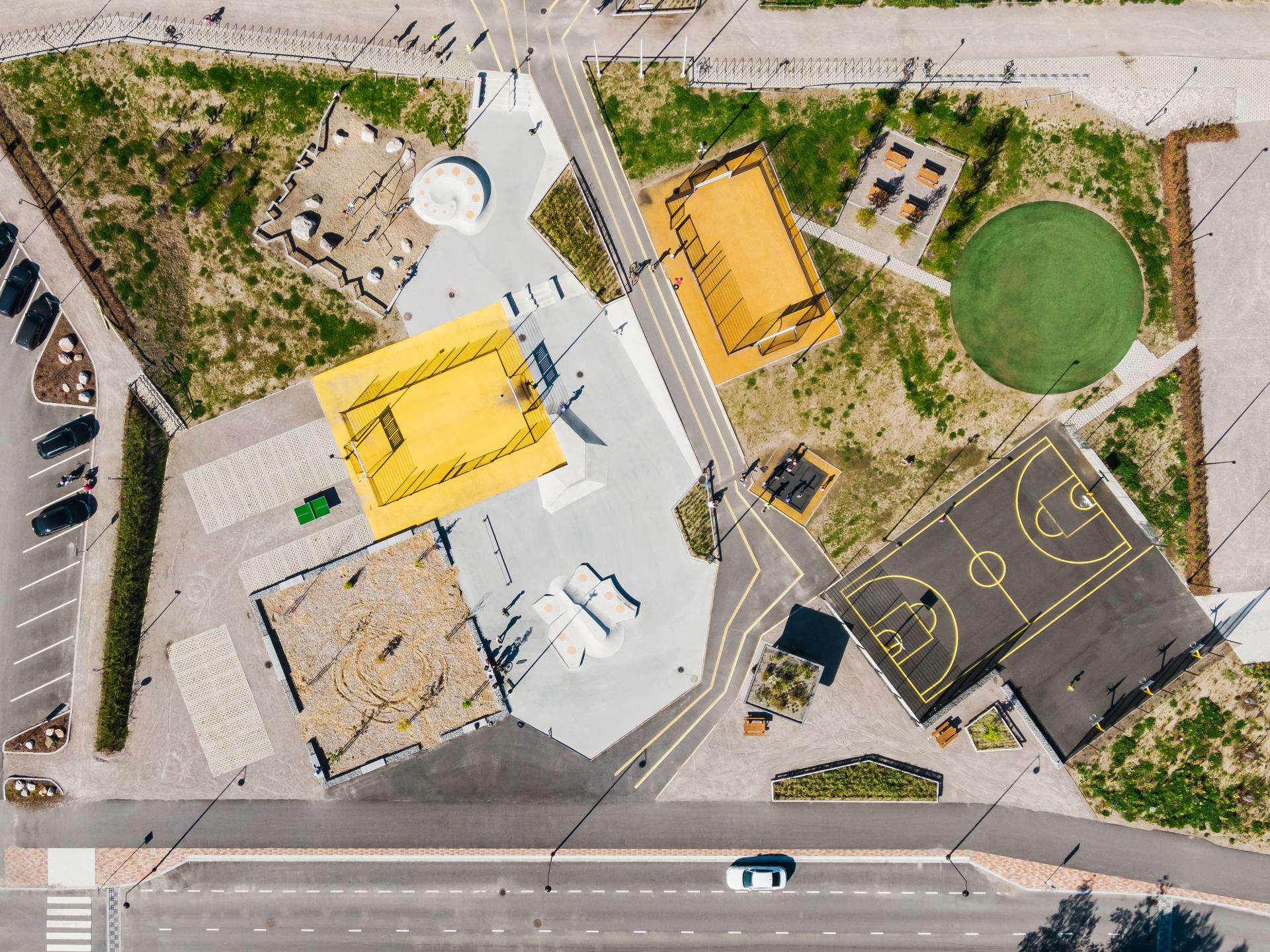 Several yard structures are designed to be versatile, allowing both learning and play, and day and evening use. They are suitable for users of different levels and ages. The use of the yard and the local sports area will continue after the school day, and the yard has also become popular destination to residents of the surrounding area on weekends.