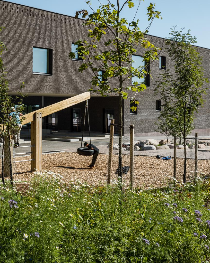 The goal was to create a yard area that would arouse the interest of children and young people and activate them to play, learn and move all year round, but that would still blend into the environment. Vegetation and topography is used to create diverse spaces ad views, still fulfilling the functionality and safety requirements. Landscape and the building were designed in close collaboration and they create an entity.