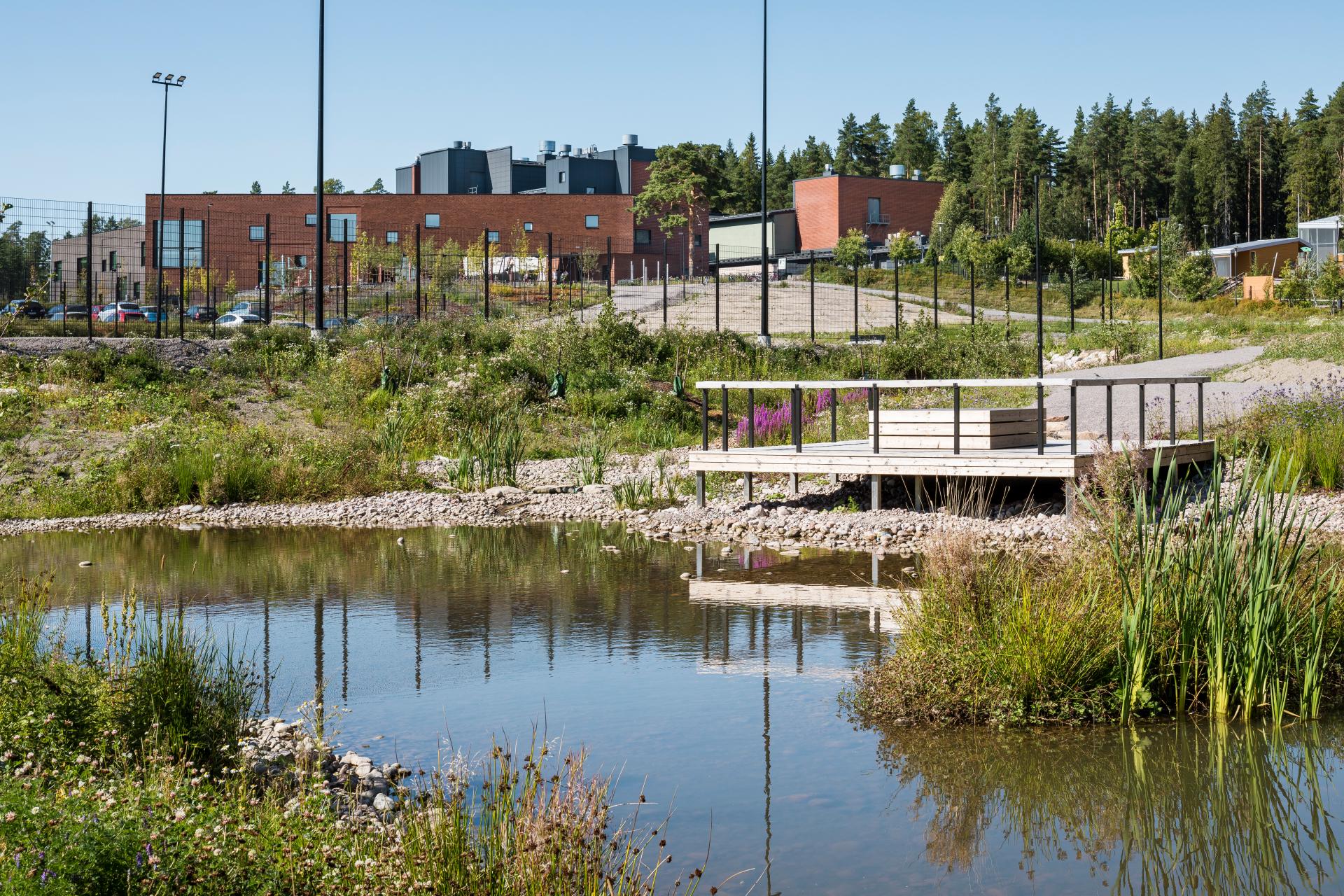 A stormwater wetland is located in the southeast corner of the plot, to which, in addition to the stormwater of the plot, the waters of a wider area are directed. The wetland was integrated into the learning environment by designing a pier and a land auditorium. The surface of the wetland water is regulated for safety reasons.