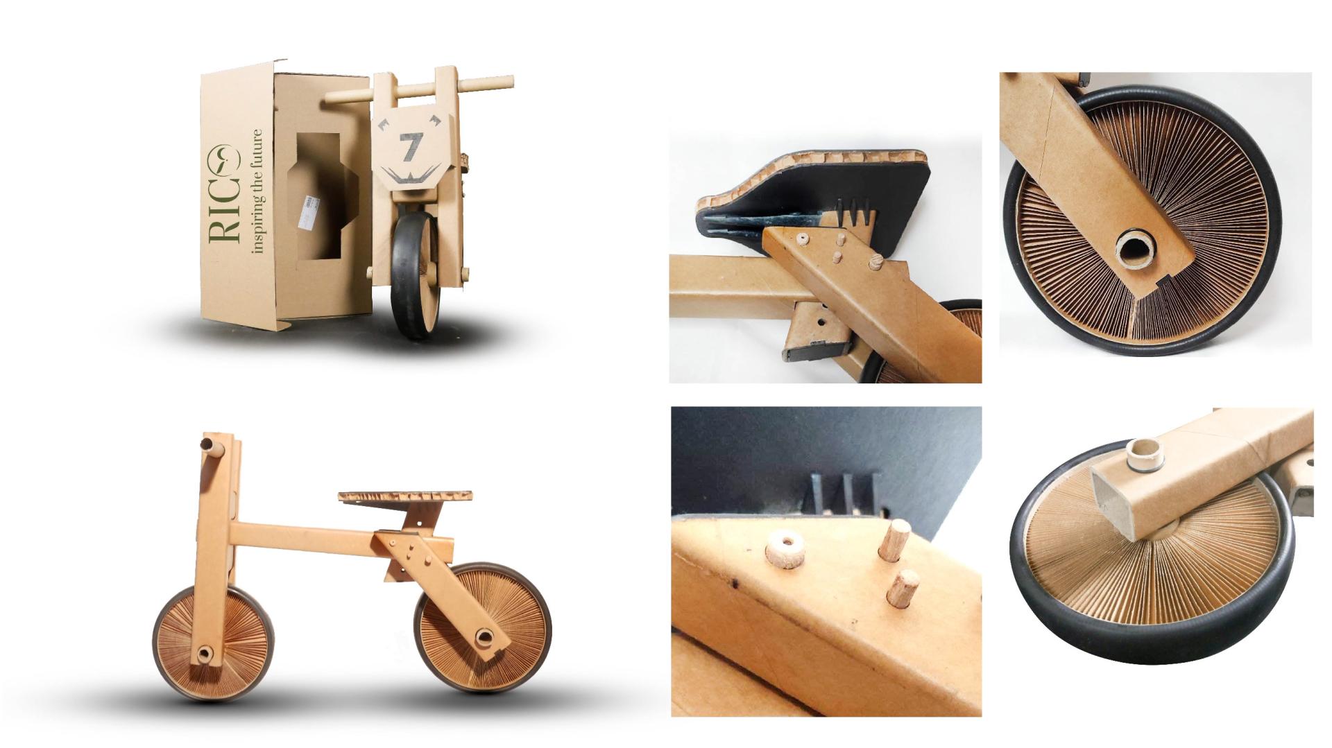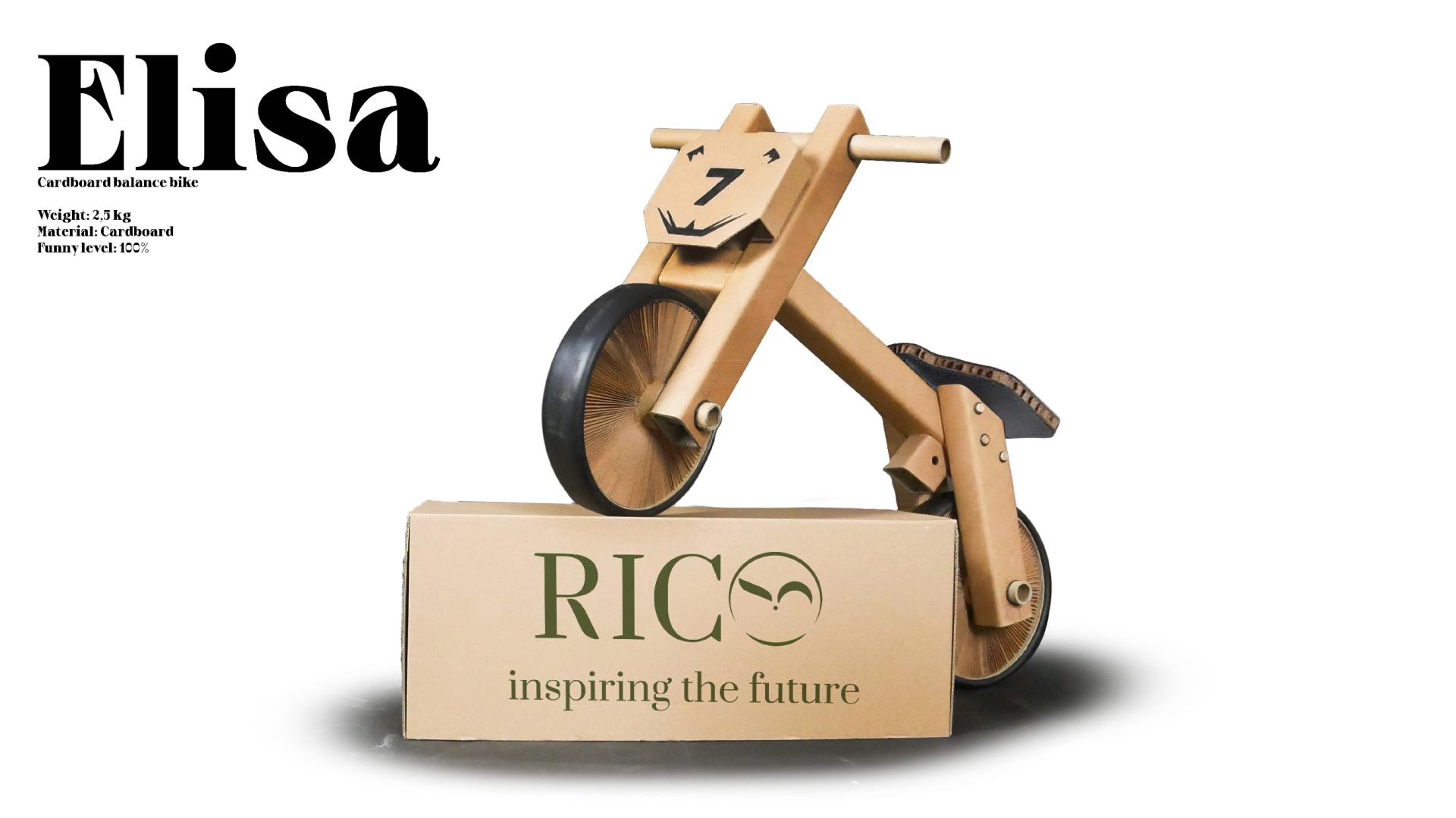 The first product we developed is a balance bike 95% made of cardboard. There are no similar products on the market. The great thing about this balance bike is that is meant to be built by parents (or grandparents) with the child (or grandchild) together in order to spend some quality time together. The balance bike arrives at home with single components and an instruction book to build it. During the constructions happens 3 things (that are basically the purpose of our project): 1) the parent and the child spend some time together; 2) there is a transmission of practical knowledge between the parent and the kid; 3) there is a transmission of value, respect for the nature and the environments in general from the parent to the child. This is exactly what Rico aims to do: create a community of sustainable people who consciously decide to buy sustainable products and educate their children to this mindset.