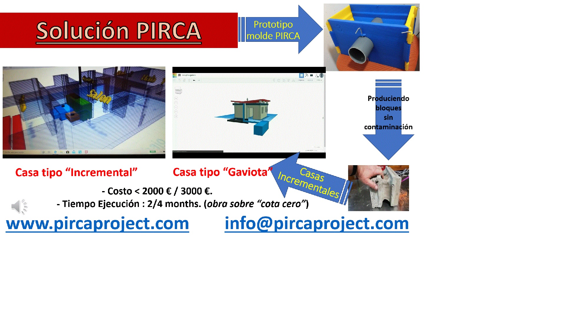 The project presupposes low-cost construction in areas of natural disasters / war conflicts / low income to empower families to solve their housing infrastructure problems. The use of this method implies the creation of jobs worldwide and the ecological recovery due the high use of recycling materials from beaches and oceans / debris produced by wars or natural disasters. It is modular, anti-seismic and reusable method, with facilities to produce houses at costs close to zero. Structures based on an special morphology of the pieces produced by the PIRCA mould provides facilities not only to be placed in walls and floors, in adittion introduce new facilities to incorporate other disciplines linked with construction (plumbing, electricity, A/A, isolation etc). Plastics, glass and used tyres with proper granulometry can be used massively in concrete formulation in this no tech bet for housing in development countries globally. No electrical energy at all can be a choice using human effort.