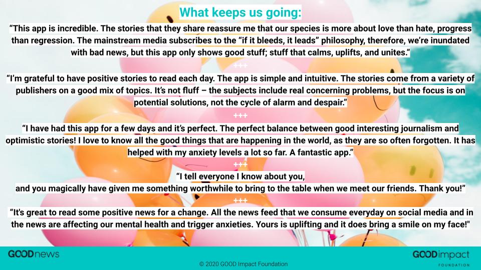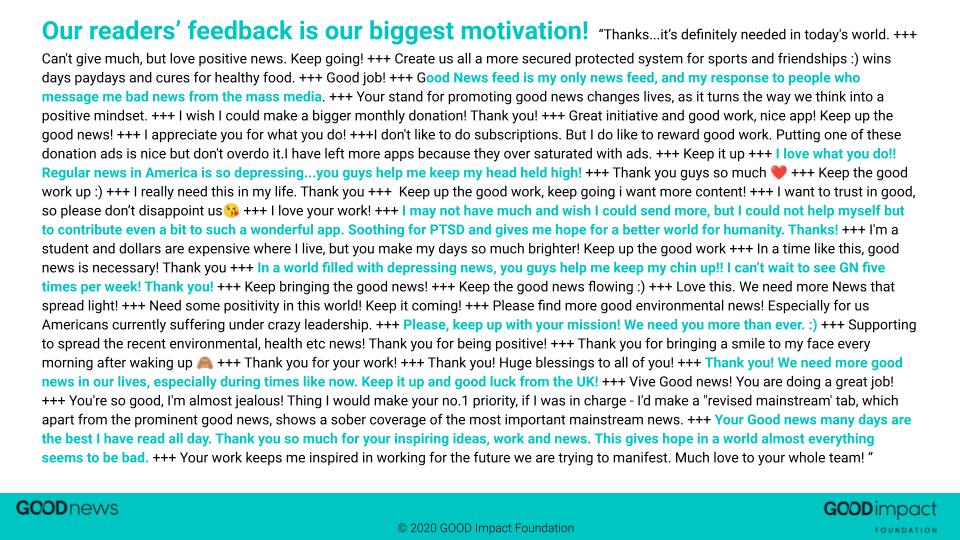 We have been lucky enough to get regular feedback directly from our readers and are happy to witness the positive impact GOOD news has on mental health. In the current global climate many people are overwhelmed by the mainstream media and simply can't cope with the amount of bad news presented to them. Many issues are dealt with in a sensationalist manner that makes it seem like there is no way out, no solutions, no perspective. This is not true. Solutions are everywhere - they need to be made more visible, to more people, without cultural or educational barriers. We are proud to be able to provide a platform for information, inspiration and optimism - for the simple “news consumer”, for people seeking positive news, but also for scientists, activists, and change makers to inspire one another to find even more innovative solutions to global, or sometimes local, challenges.