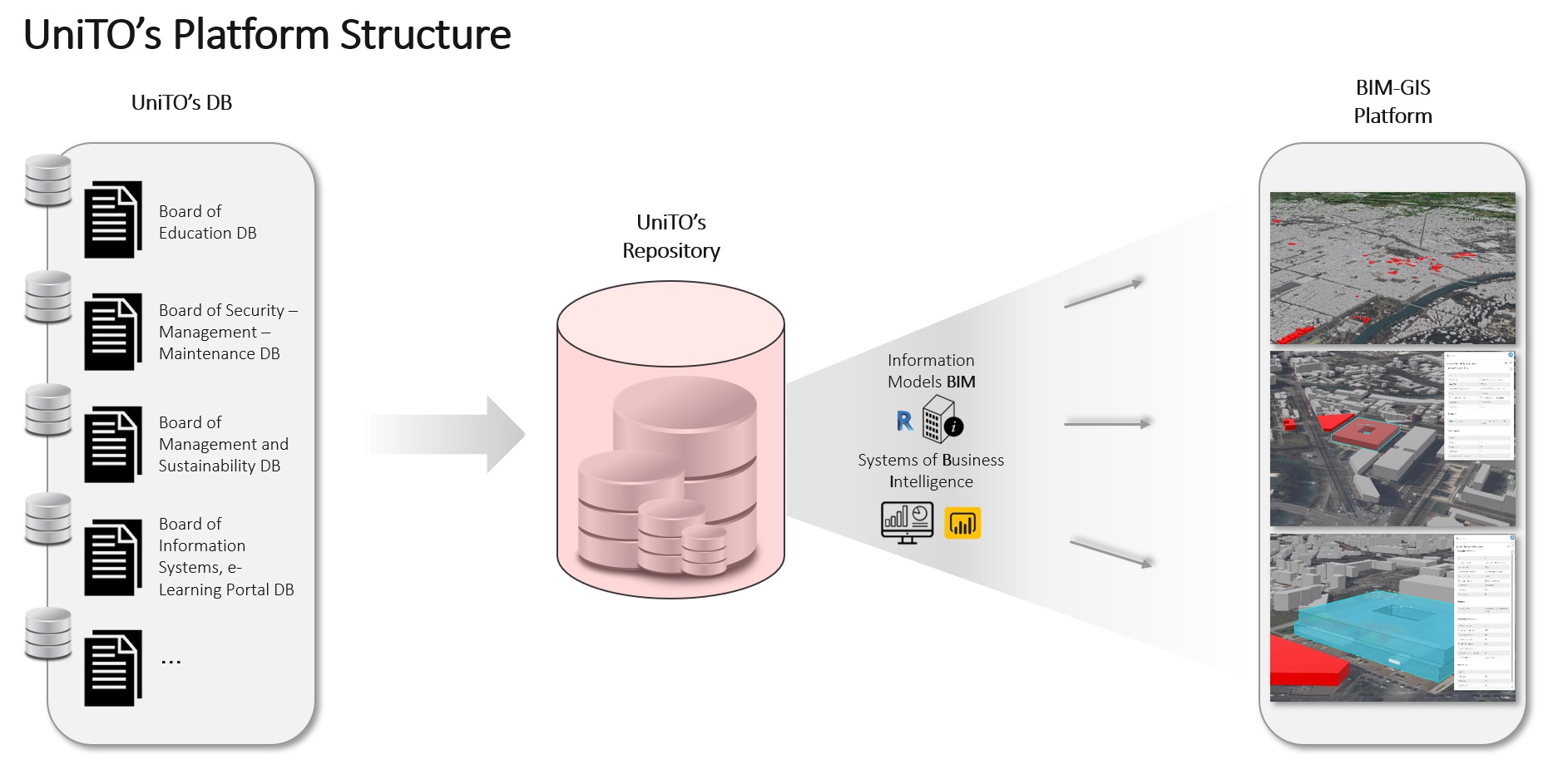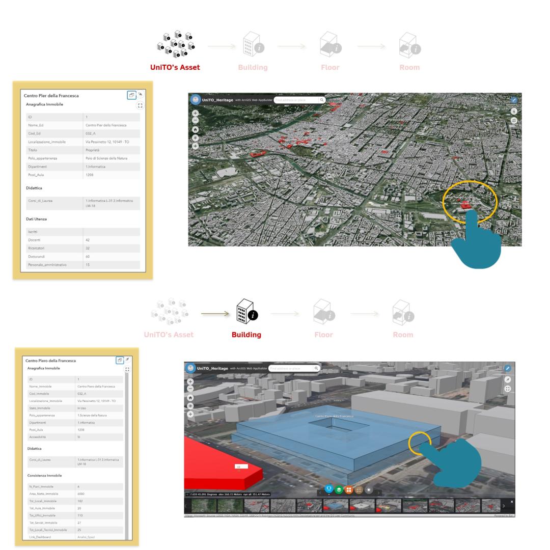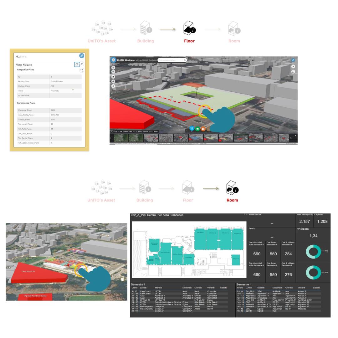 Reinventing UNITO aims at creating a BIM-GIS platform for asset management of the diffuse campus of the University of Turin in order to promote efficient and sustainable operation and maintenance of large building stock. The core focus is the information management through AM (Asset Management) for the valorization and energy transition and management of the university buildings adopting a users’ centered approach by means of a web-based application that promotes transparency and collaboration.