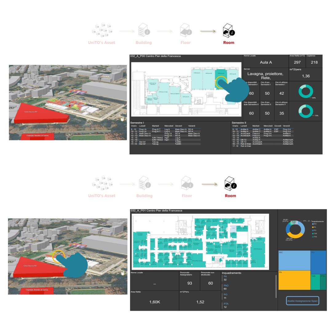 Reinventing UNITO started with the active participation of the university staff to define needs and requirements that are used to structure the space demand and the optimization of people flows. The results of the project are communicated at various levels with respect to the stakeholders involved, from university staff, students, citizenship where the built heritage of the University of Turin is inserted. The communication activities are oriented to show and general level the possibilities and advantages that digitization involves in the management, organization, and optimization of spaces going to verify the adequacy of these with respect to the variable needs of time-related to the expectations of users and the variability of flows, ensuring greater efficiency and safety in use.