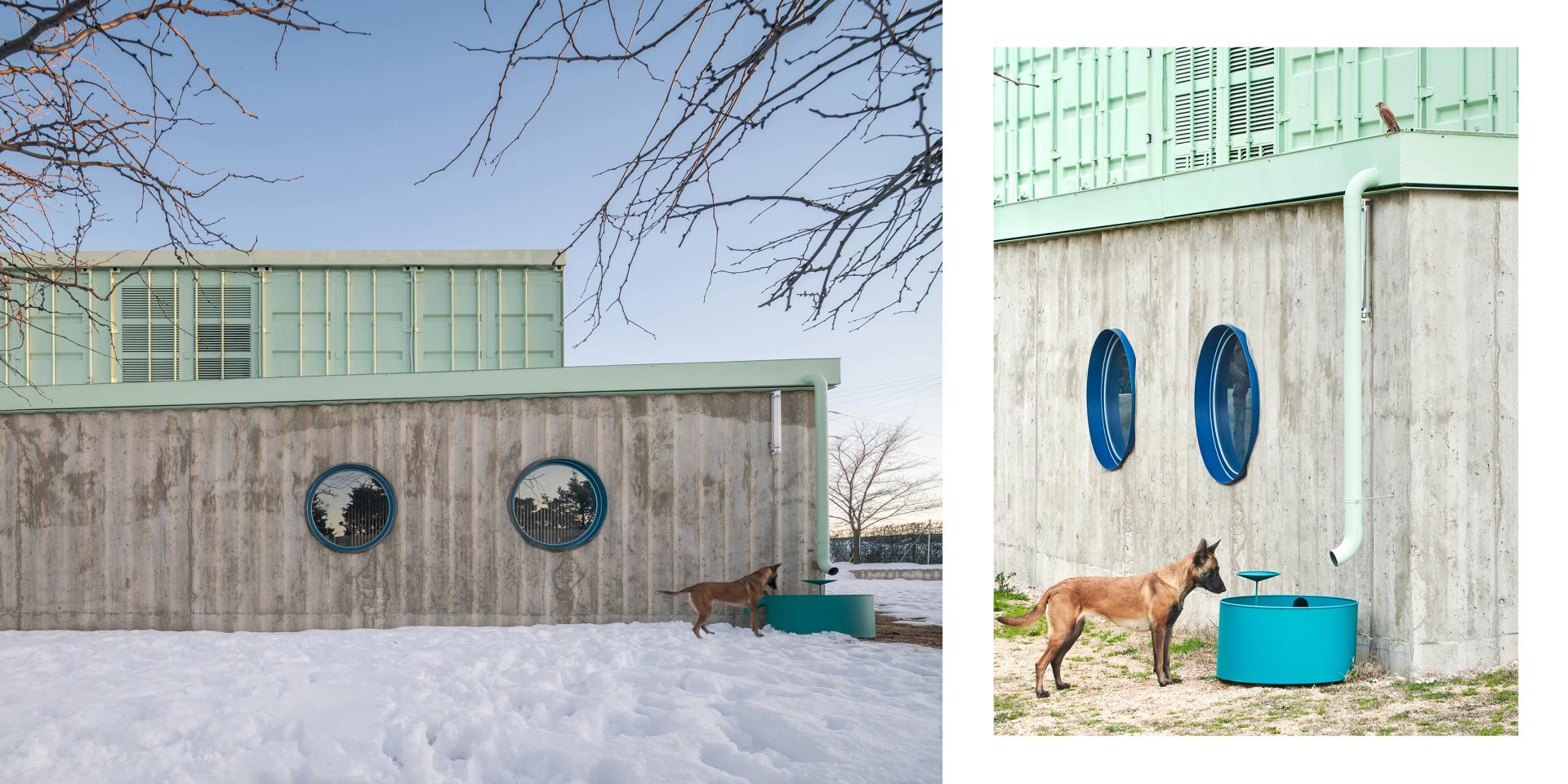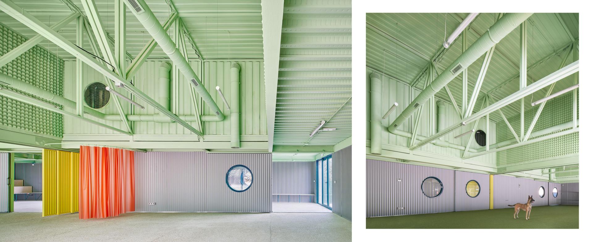 Its architecture is a multi-species design. While the two main classrooms are busy with dog–human pairs practising agility, birds nest on the upper floor’s nest-facade. Small birds of prey feed on rodents, maintaining a balance with local flora. Non-humans are at the centre of the design. The floors, usually designed for people in shoes, are adapted to the pads of canine paws: the training classrooms use removable rolls of dog-approved turf. Interior openings are raised to heights of more than one meter to avoid doggy distractions; louvred window shutters shade the south facade. Outside, the rainwater from the roof is harvested in large troughs for dogs and birds. Spoken word turns bark, and the interior surfaces are clad with sound-absorbing pyramid foam insulation, minimising noises and reverberation.