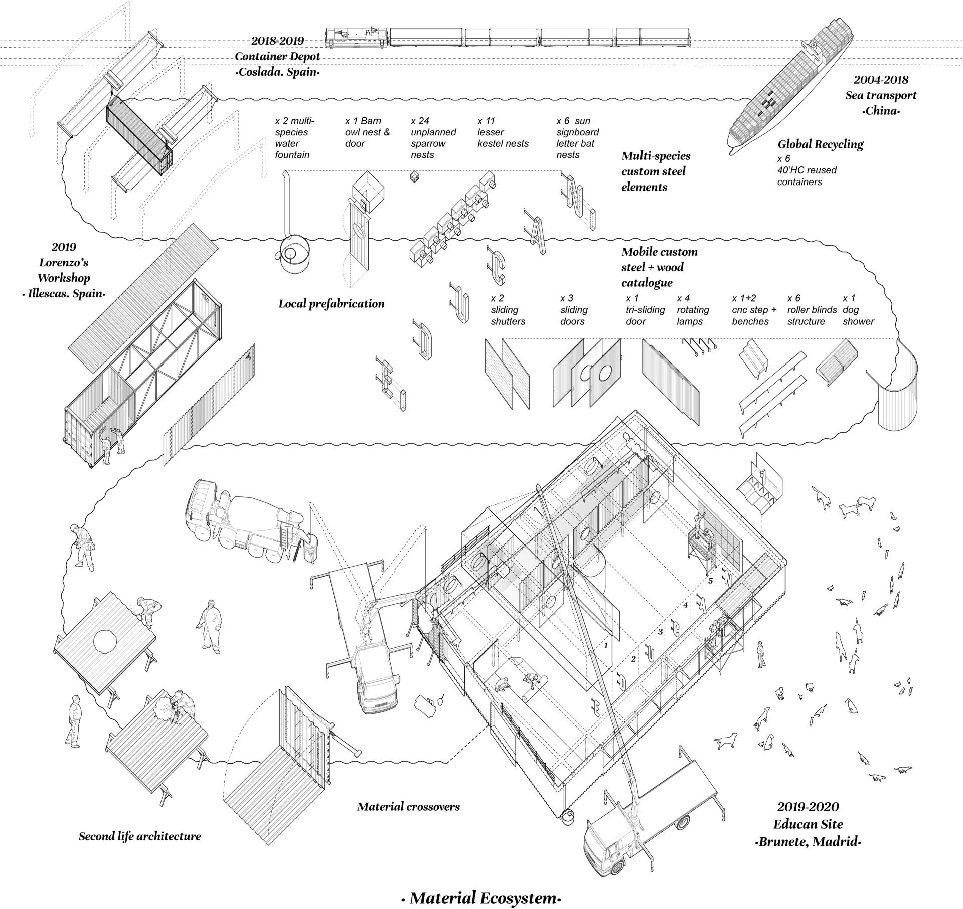 The strategies of circularity (material reuse), and the reduction of material and energy resources, are similar to other practices developed by the architects of Educan (for example, the FUA -Furniture Urban Alphabets- project, which recovers obsolete materials from municipal warehouses for the manufacture of furniture and public equipment). Especially the strategies for the reuse of maritime containers have been relevant and widespread in the last 10-15 years, although in the case of Educan unprecedented proposals for the use of containers have been tested, as roofs for buildings, fragments of the same containers as formwork elements, or ventilated facade cladding for other pre-existing buildings. This set of open source strategies can also be useful for other interventions that reuse sea containers as raw materials. The reduction of the ecological footprint of the building with the reuse of a maritime container is estimated to save about 4000 kg of steel, or the CO2 equivalent to the pollution produced for the entire useful life of a standard vehicle with a gasoline engine.