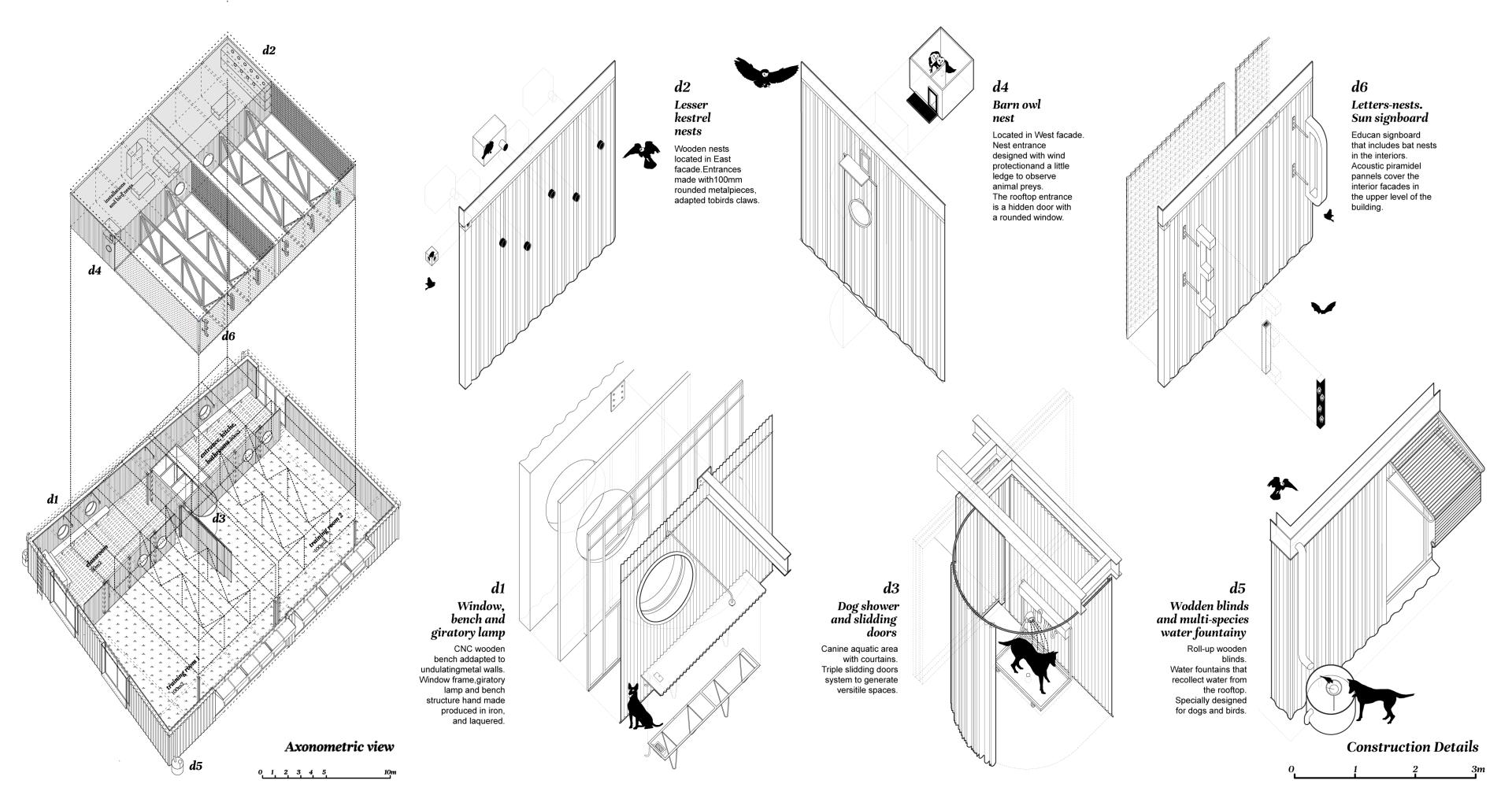 It is a building designed for humans and non-humans: it integrates nests, reuses rainwater for birds and dogs, and it is designed by turning dogs in the center of the design decisions.