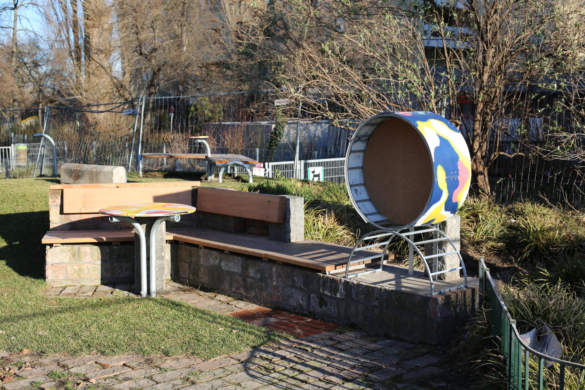 The basis for the aesthetic approach was the stock of available materials from the old park furniture on site: The in-situ resources (former sitting area, historic bricks, brick rubble, granite blocks, steel fences) were reconsidered and recombined with the utmost care for the material, the environment and the specific spatial demands. The design also takes up "waste parts" of Vienna's standard furniture and returns them to a recycling loop. In reference to this standard furniture prevalent in Vienna and in a playful expansion of its design vocabulary, the new design invites to experience the materials and their properties in raw form (metal, wood, stone, plastic, clay). Through the new application or reshaping, some materials take on a completely different character, e.g. the plastic waste that, newly processed and pressed, now functions as table tops. Furthermore, the concept builds on re-usability, recyclability and repairability by keeping all parts dismountable, replaceable and untreated (blanks). The project brings the old, the discarded and the small - and thus above all the distinctive - back into the process of building/design; it celebrates intangible resources such as the history and identity of the materials/objects.