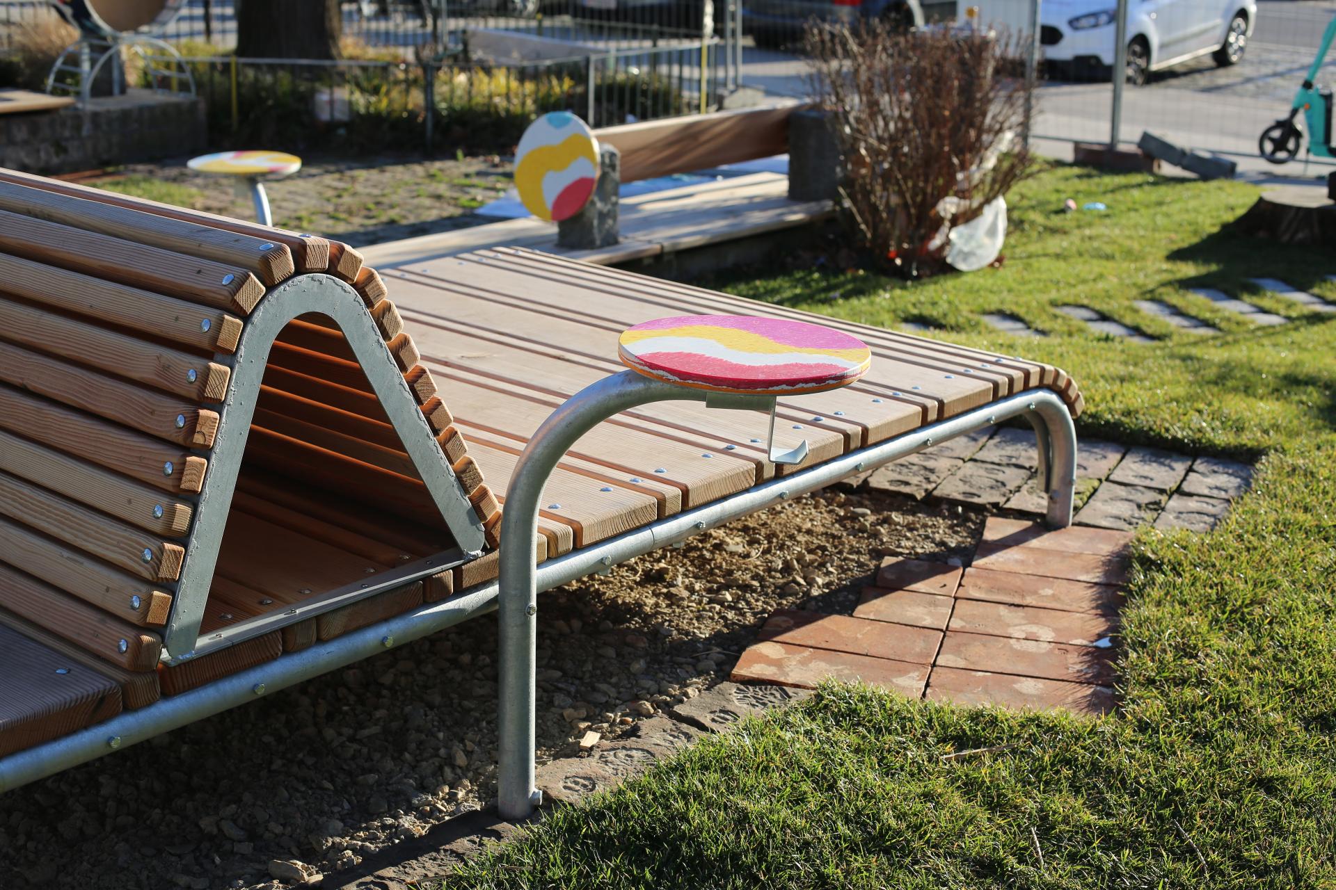 Furthermore, the design and choice of furniture was influenced by a study by Social Design (2017), which had shown that the quality of stay in public space and social cohesion in the neighbourhood are low. Based on a broad understanding of street furniture, the project therefore takes into account the specific needs of different user groups and tries to stimulate social exchange through design e.g. benches that can now also be used by people with limited mobility who use the park with a rollator. Hence, a central goal was to create a lively centre for and with the community through activating all (im-)material potentials of the space and thus contributing to the quality of life and experience.