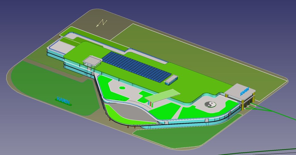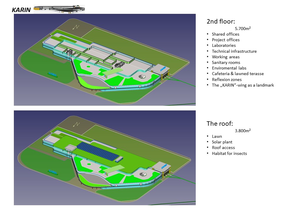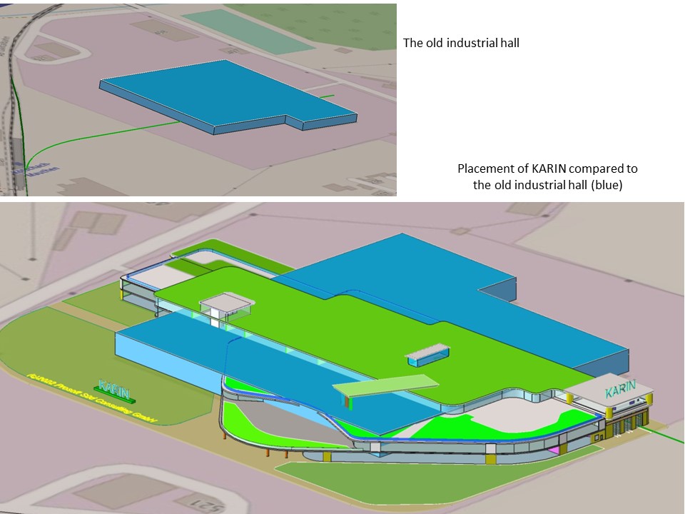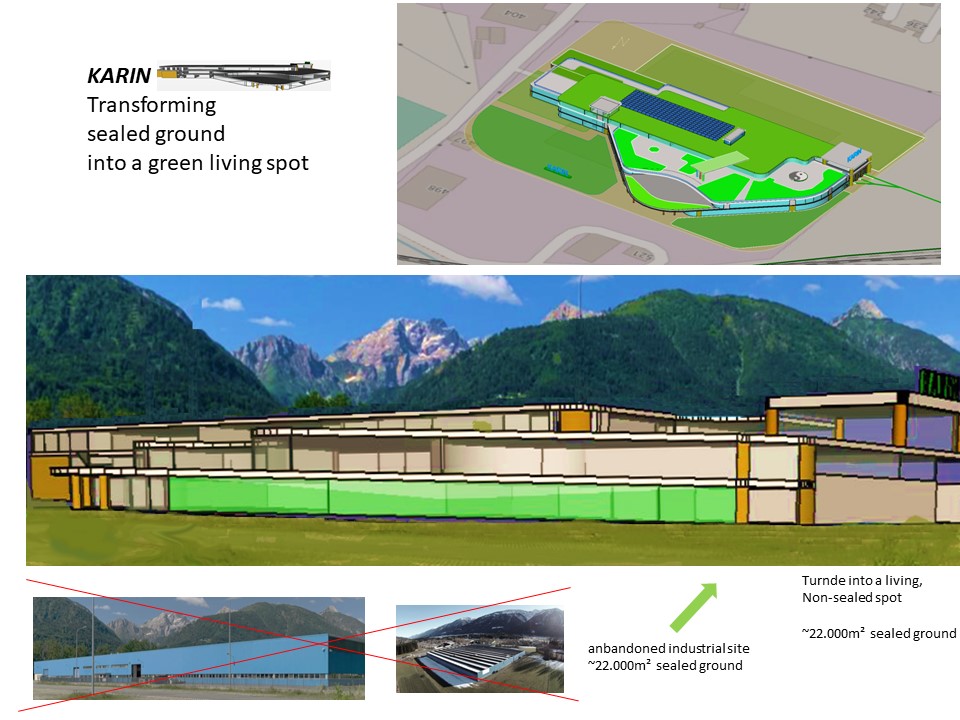 KARIN will renovate an old industrial building that has not been used in the past few years into a modern and leading example of sustainable building. One of the main goals was to battle the increase of sealed surfaces and turn a now sealed area into a then green one. Concrete pathways will be reduced to the minimum needed, lawns and natural pathways will surround the new center, gardens will be installed with the aim to create destress spots for workers and habitats for bees and other insects and all roof surfaces will be vegetated in different forms.
