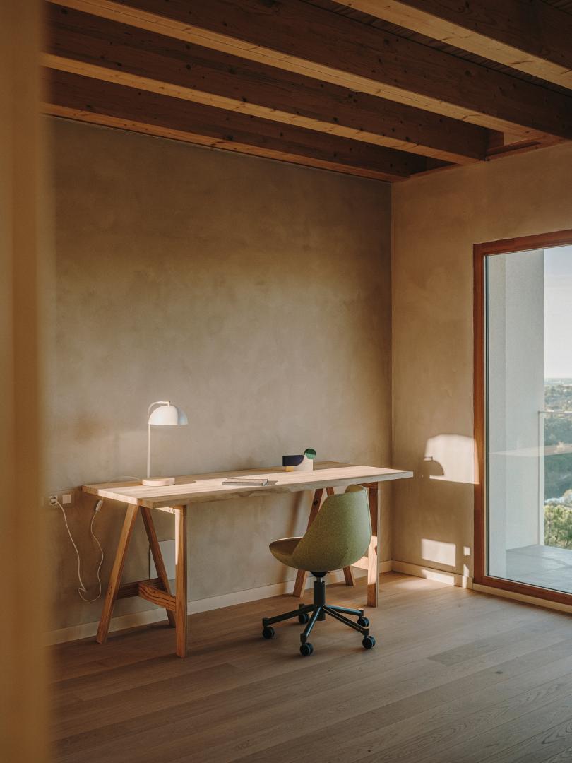 In addition, other natural materials used in the house occur to have multiple properties. Such as the clay finish that unifies the ground and first floor, which has a high hygroscopicity that allows it to regulate humidity naturally, absorbing or releasing water steam depending on the conditions of the interior environment and maintaining the average relative humidity between 40-60% according to health reference recommendations.
