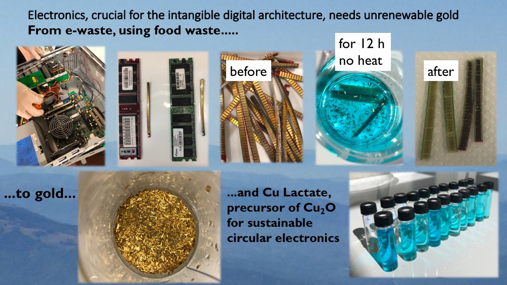 Electronics, crucial for the intangible digital architecture, needs unrenewable gold. Gold is profitably peeled from e-waste by an oxidant and food waste acid. This sustainable room temperature strategy provides pristine gold, perfect for circular electronics and the precursor of a precious photocatalyst. Inspired by green chemistry (zero waste/renewable and safer reagents/no solvents/energy efficiency/closed loops) this education initiative enables a fair, fine industrial scaleup and employment